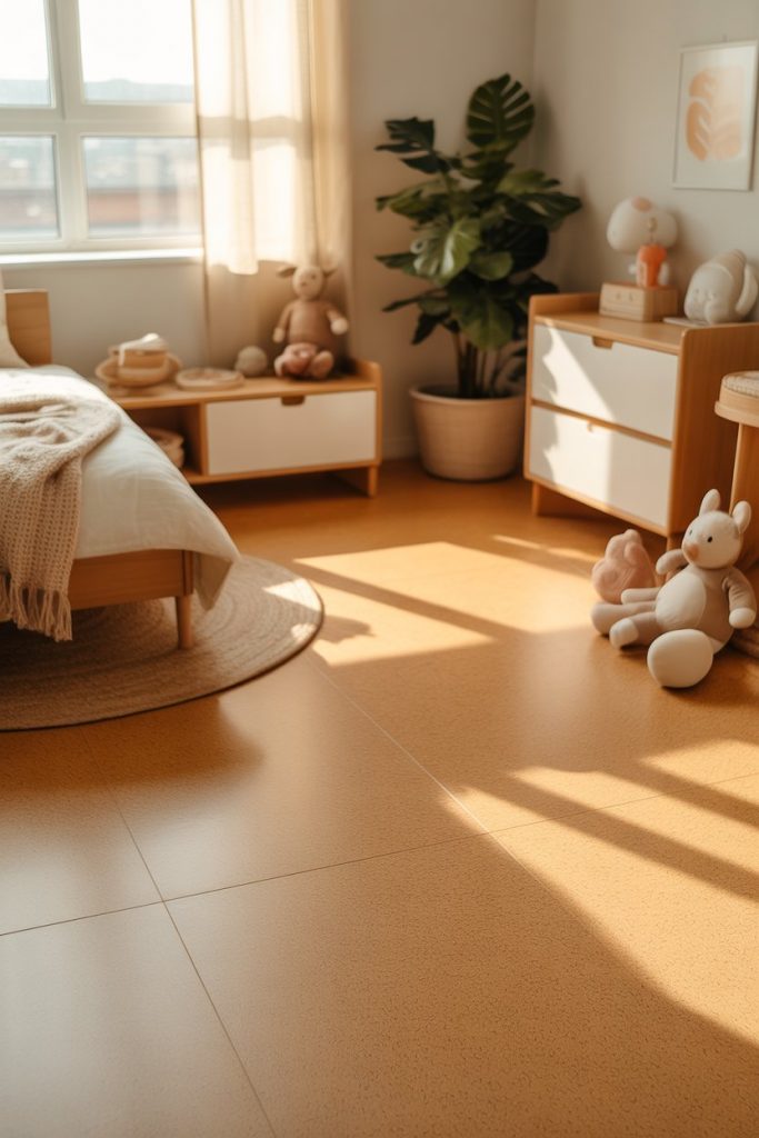 Cork is emerging as a top flooring choice for eco-friendly kids room designs due to its warmth, sound absorption, and renewable nature. It’s softer underfoot than hardwood, making it gentler on toddlers learning to walk, and it’s naturally antimicrobial—a plus for families concerned about allergens.