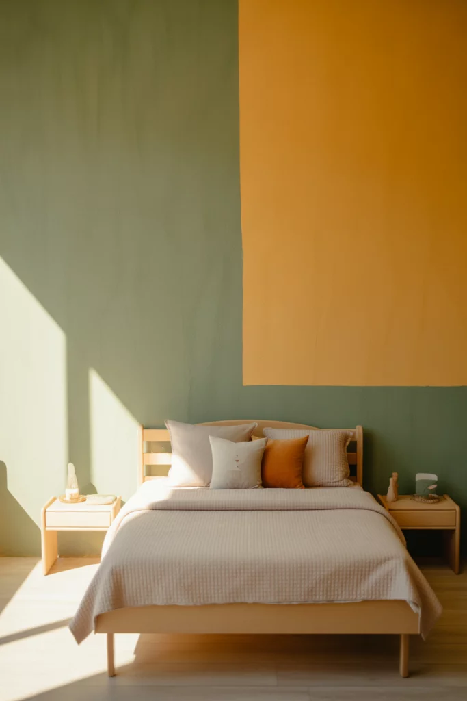 Soft beige walls paired with warm terracotta accents create a calming foundation that works beautifully in a modern kids room. This palette feels grounded and timeless, avoiding the overly saccharine tones that can date a space quickly. Add woven baskets, a low wooden bed frame, and clay planters to complete the look. It’s especially popular in sun-drenched California homes where natural light enhances the warmth.