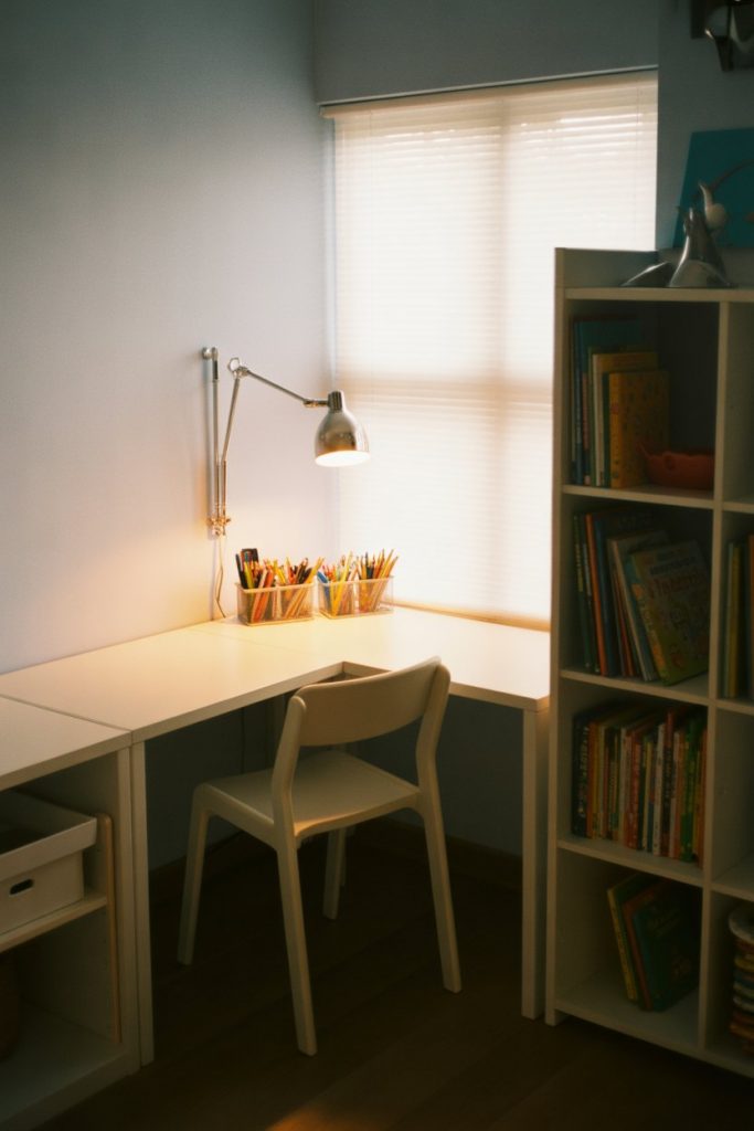 Tucking a desk into an unused corner maximizes space in a functional kids bedroom while creating a dedicated study area. L-shaped or triangular desks fit snugly into tight spots, and wall-mounted task lighting keeps the work surface bright without taking up room on the desk itself.