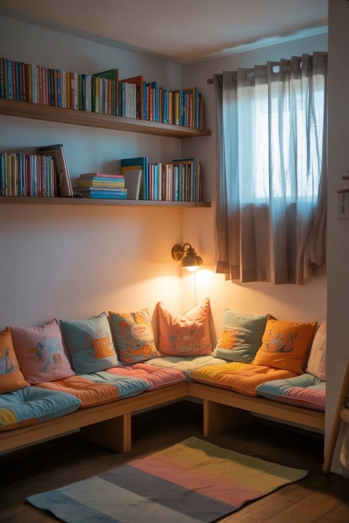 A dedicated reading corner with built-in cushioned seating and floating bookshelves turns any awkward alcove into a cozy kids room focal point. Install LED strip lighting under the top shelf for evening story time, and add a soft throw for texture. This idea works especially well in homes with architectural quirks—bay windows, eaves, or unused closet spaces.