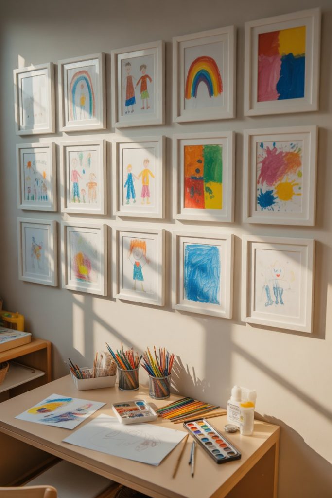 Instead of hiding drawings in a folder, create a rotating gallery wall that celebrates your child’s creativity in a personalized kids room. Use matching frames with easy-open backs, or install a simple wire grid with clips. This approach turns clutter into décor and gives kids a sense of pride in their space.