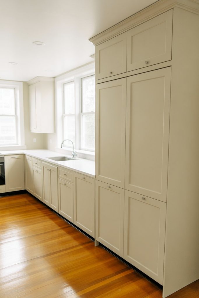 A painted white cabinet remains a favorite for 2026 because it adapts easily to light and dark two-tone schemes, white countertoppairings, or classic dark granite counters. This tone is perfect for a small-space kitchen because it expands visual width and reflects natural light. It also works well with wood floor kitchens, keeping the room bright without feeling sterile. Designers call it “the new timeless,” a shade that stays relevant beyond Paint 2026 predictions, just like the long-lasting neutrals featured on Remodelista.