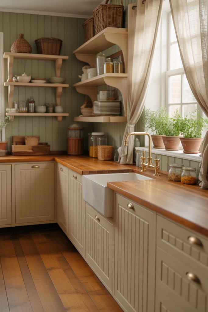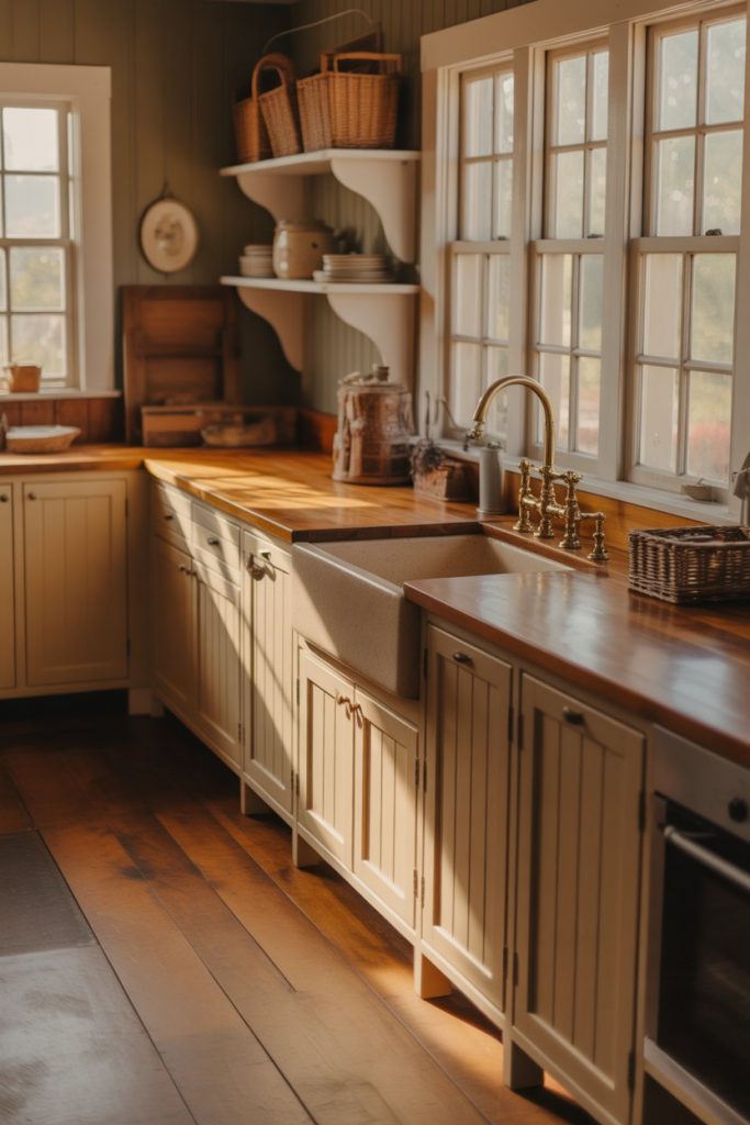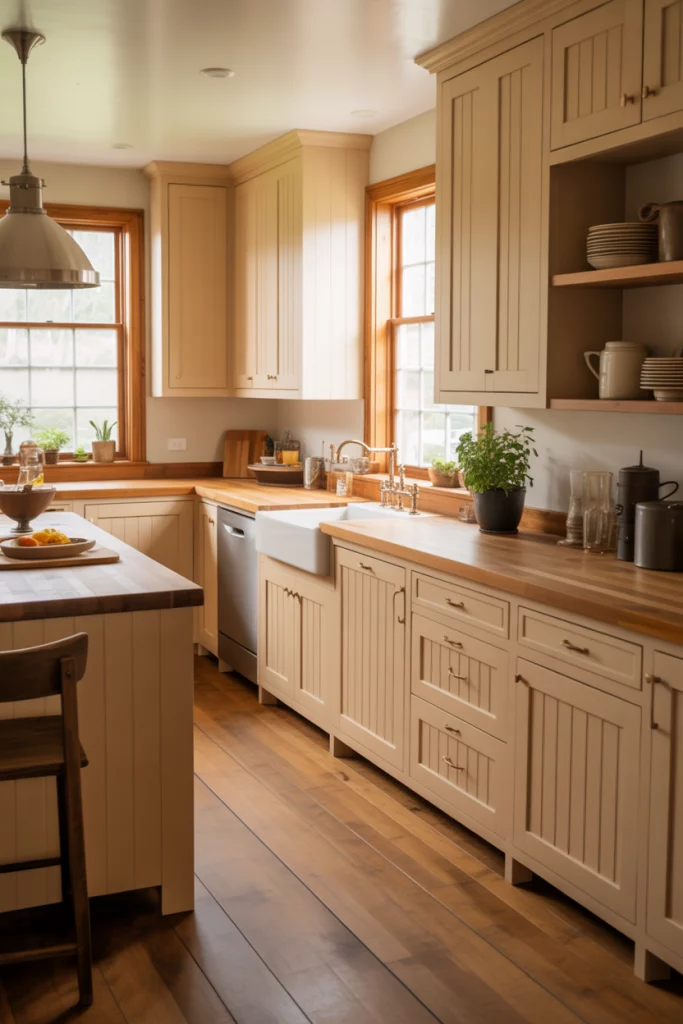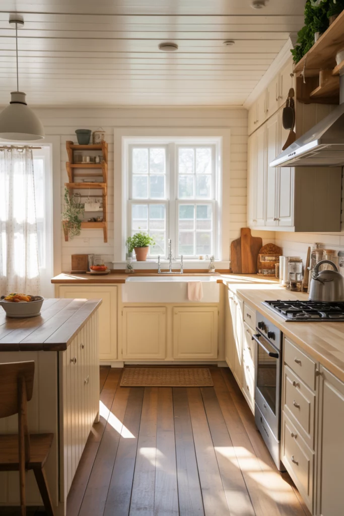 For farmhouse-style enthusiasts wanting a cleaner version, adding creamy off-white cabinetry with butcher block counters and toned wood floors provides a modern lived-in vibe.