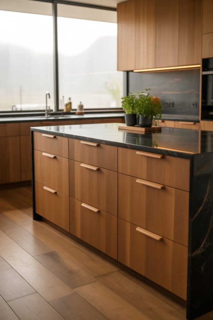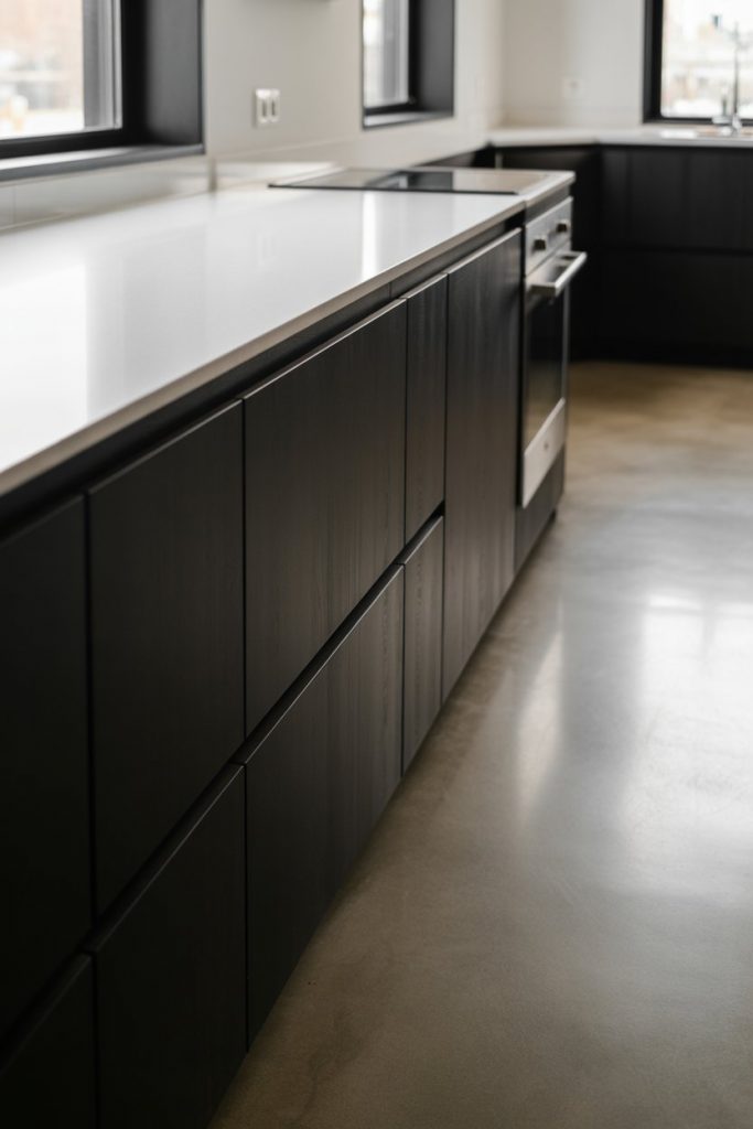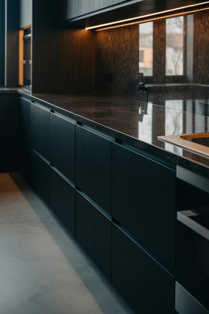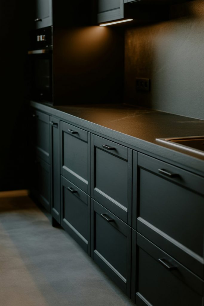 Flat-front black slab cabinets feel sleek and architectural, especially when paired with white countertopquartz or dramatic dark granite counters. This look fits modern lofts or homes with industrial details like steel framing or concrete floors. The finish hides fingerprints better than gloss and gives a small kitchen surprising depth. Architectural Digest notes that matte black cabinetry is no longer risky—it’s a curated choice for homeowners who want bold simplicity in 2026.