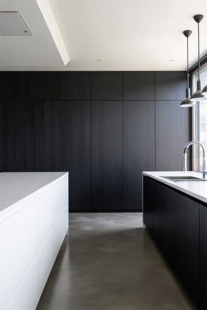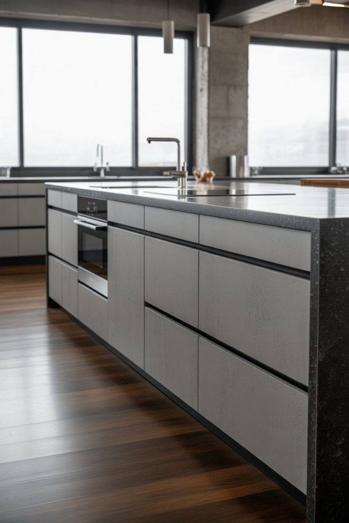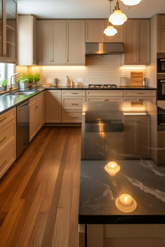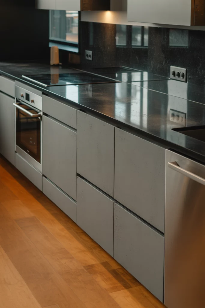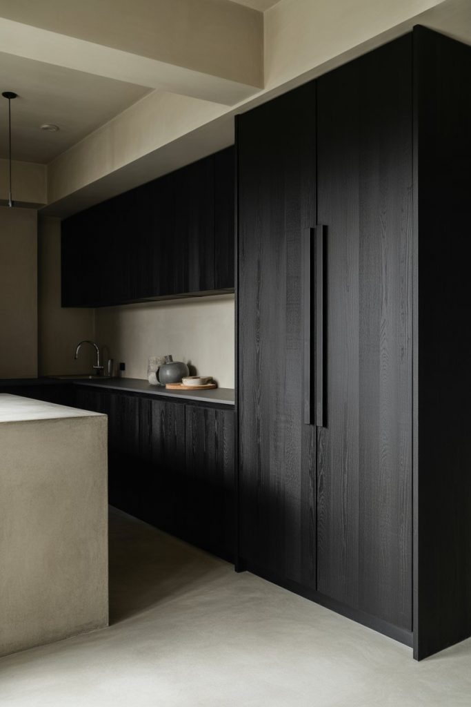 Flat-front black slab cabinets feel sleek and architectural, especially when paired with white countertopquartz or dramatic dark granite counters. This look fits modern lofts or homes with industrial details like steel framing or concrete floors. The finish hides fingerprints better than gloss and gives a small kitchen surprising depth. Architectural Digest notes that matte black cabinetry is no longer risky—it’s a curated choice for homeowners who want bold simplicity in 2026.