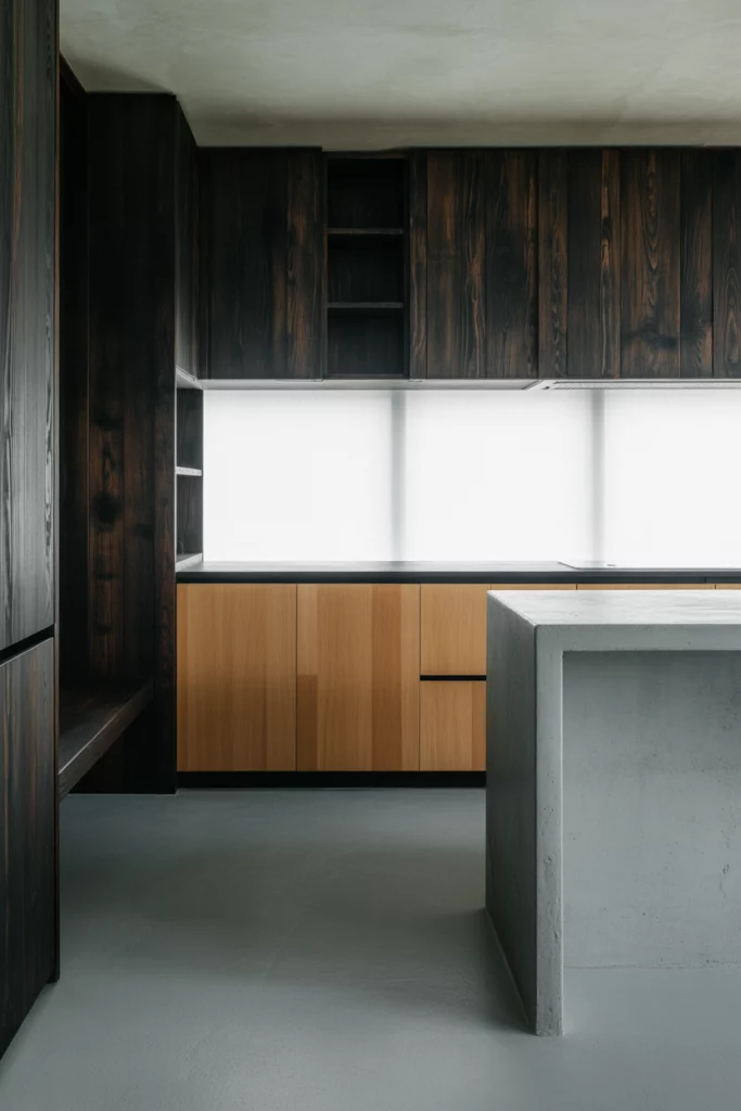 Charred wood, or Shou Sugi Ban, is a lovely finish that can appeal to the lovers of raw, natural materials. This style has an artisanal dark appeal and is a fusion of Japanese craftsmanship and modern restraint, blending beautifully in open spaces with concrete floors and dark accent walls. It also works well in light and dark two-tone kitchens. It provides texture without the need of additional décor. The tactile surface disguises wear and tear. This is a functional style and practicality.