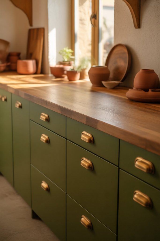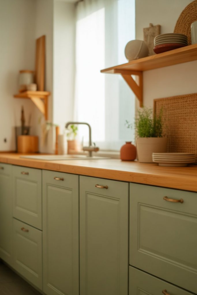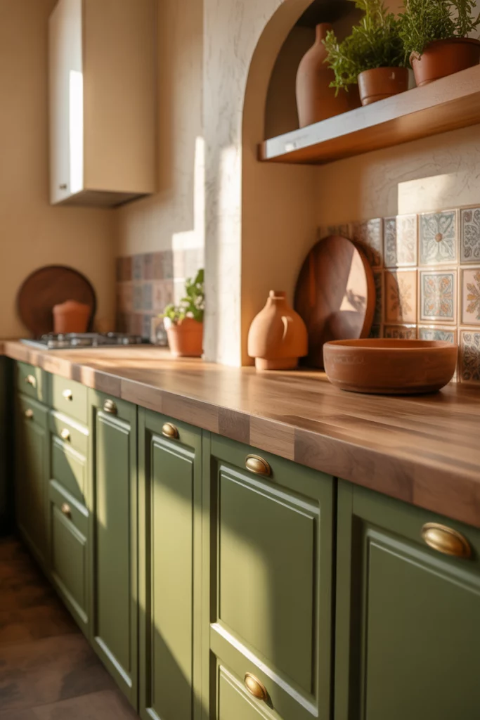 Soft olive green tones feel sophisticated yet natural, balancing beautifully with butcher block counters or subtle dark countertops. This hue is less saturated than emerald but warmer than sage, creating a cozy Mediterranean atmosphere. It fits perfectly within the Paint 2026 palette trends that emphasize serenity and heritage charm. When paired with rattan barstools or terracotta décor, the space feels lived-in but elevated.