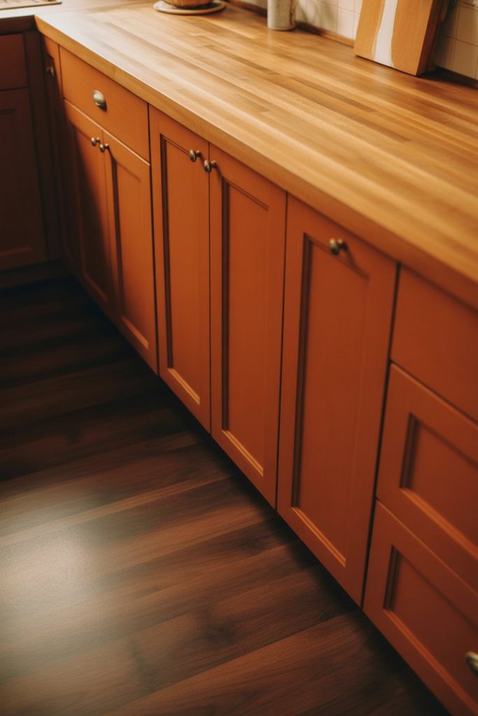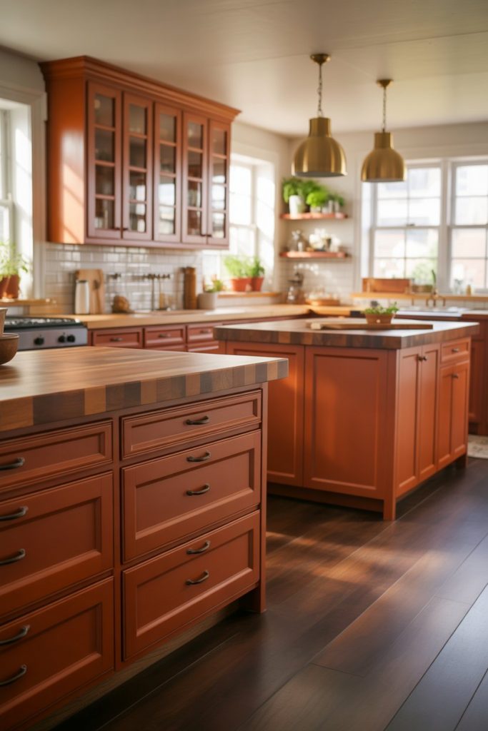 A bold painted terracotta cabinet color introduces earthy personality, pairing seamlessly with dark brown floor and butcher block counters. This warm hue is ideal for farmhouse kitchens seeking a contemporary refresh.