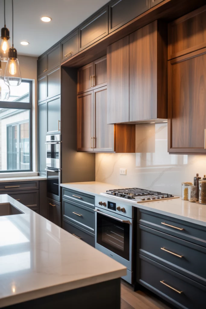 Natural wood cabinetry returns in 2026, but with smoother edges and fewer knots than rustic farmhouse styles. This tone works well with black granite counters or quartz that has faint veining. When combined with a wood floor, it builds a cohesive, organic feel from top to bottom. This is the answer for homeowners who want warmth without painted surfaces, and it feels especially high-end when paired with matte black pulls and linear lighting.