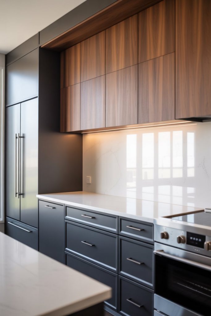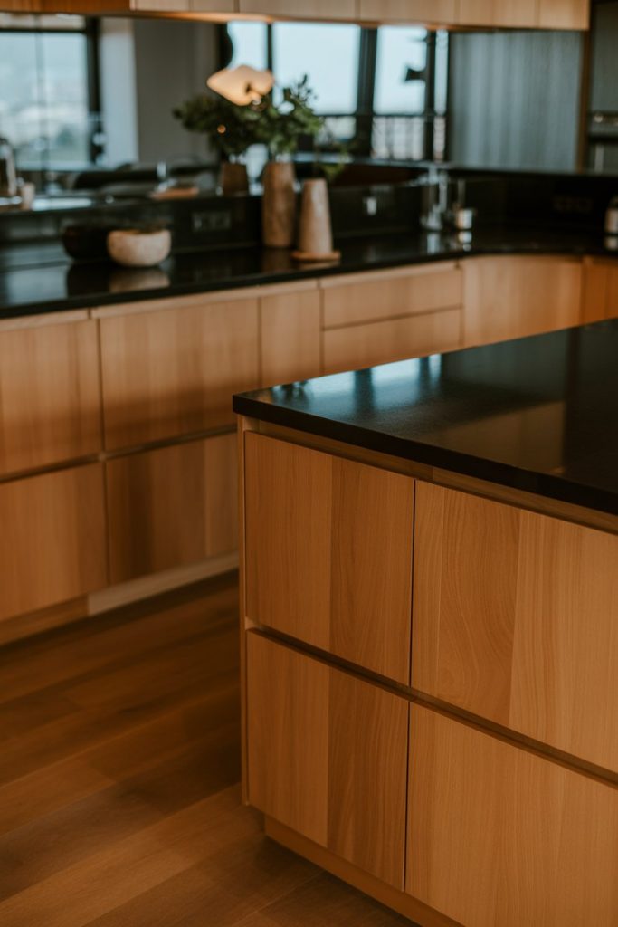The combination of a black slab cabinetry finish contrasted with rich walnut wood is a stunning execution of depth and contrast. It harmoniously balances the boldness of the cabinetry with the organic qualities of a white marble or quartz countertop. It has become a favorite for designers constructing modern luxury kitchens due to its timelessness. The combination is especially suited for open spaces, as the contrasting light and dark hues infused with the designs provide a sense of movement and visual rhythm.