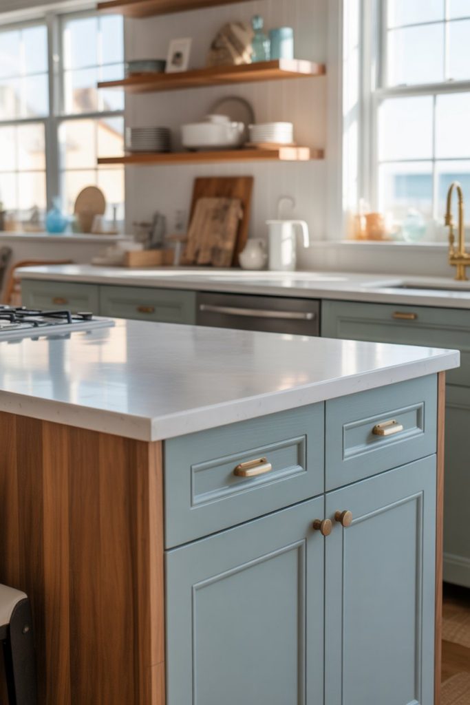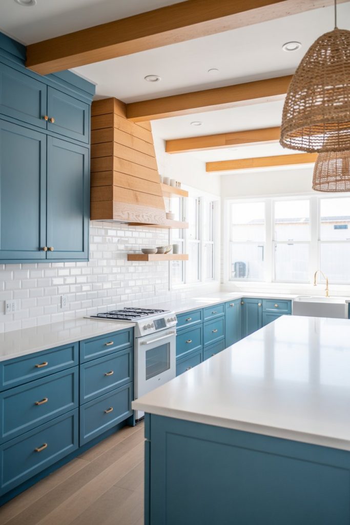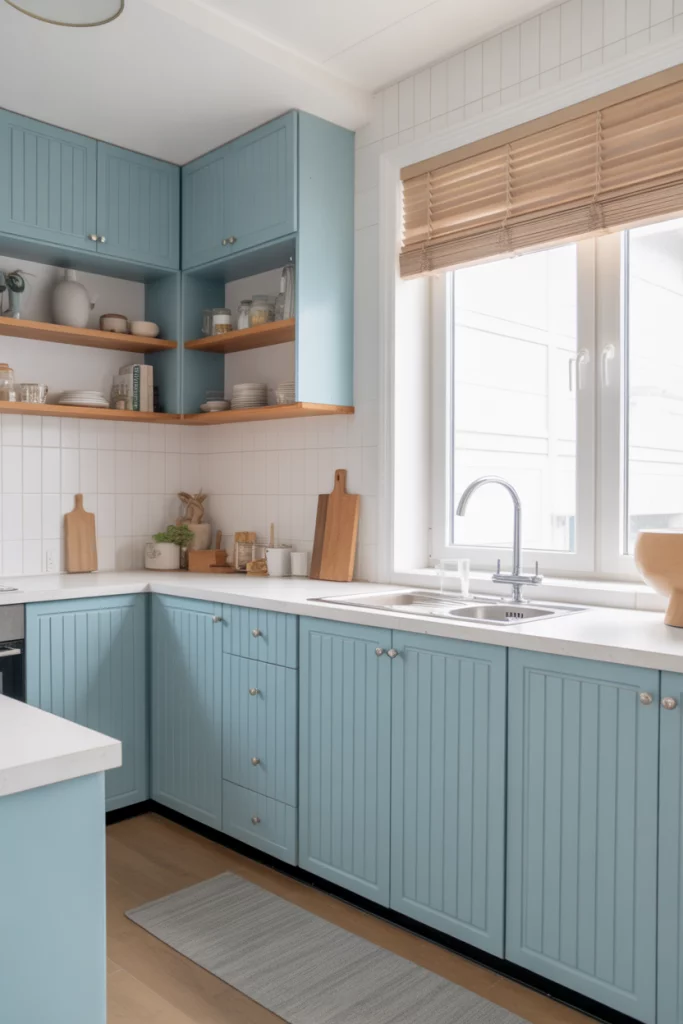 The soothing charm of a soft blue of the cabinetry has a calming coastal appeal, making even a small kitchen feel open and airy. It works beautifully with white countertopislands, light oak shelving, and woven bar stools. Designers often recommend this shade for homes that crave freshness and light. Paint 2026 trends highlight sky tones as emotional neutrals for a kitchen that is serene and reflective.
