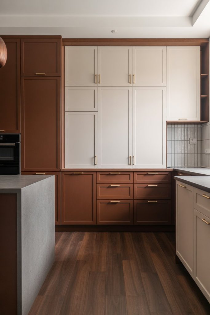 The mix of tone brown and white cabinets delivers a calm, layered feel that looks especially good with a dark brown floor or lightly textured concrete floors. This pairing bridges modern and farmhouse influences: the white keeps the room clean, while the brown adds grounded warmth. It’s a look that designer Amber Lewis often uses to make a space feel lived-in yet elevated. This combo is ideal for those who dislike cold gray kitchens and want something inviting but still current in 2026.