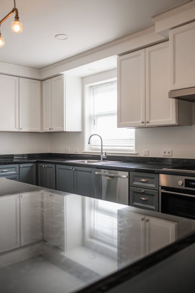 A 2-tone cabinet setup—light uppers with darker lowers—remains one of the smartest ways to bring personality into a kitchen without committing to one color. The classic version is white on top with navy, charcoal, or walnut below, which balances visual height and pairs well with dark countertops. It’s perfect for older homes where you want modern function without gutting the character. Designers like Chris Loves Julia say this is the best way to test bold color without overwhelming the room.