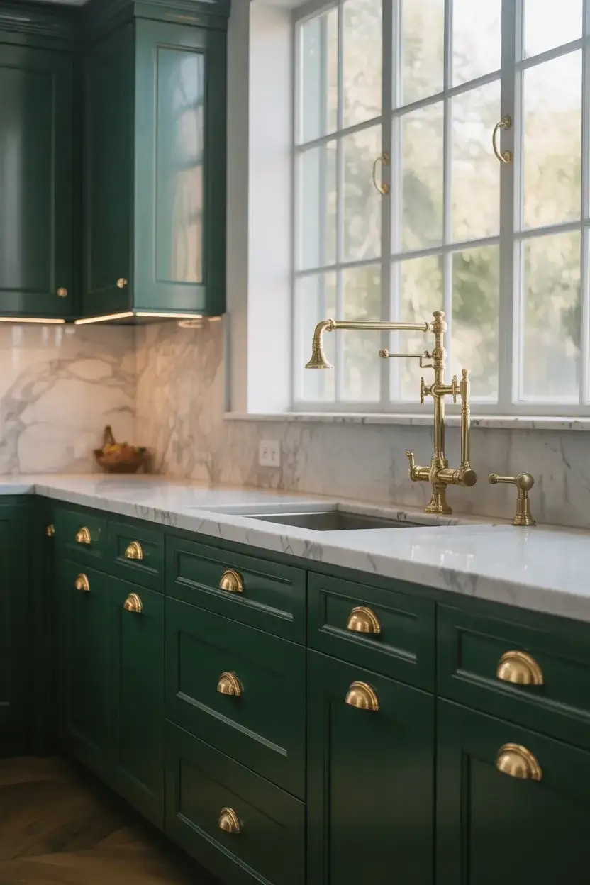 If sage green is the gentle whisper, dark green is the confident statement—and in 2026, forest and emerald tones are showing up on cabinets with unapologetic boldness. Layered with unlacquered brass hardware and white marble surfaces, a dark green kitchen feels both luxurious and grounded, pulling from nature without imitating it literally. The colors work because they follow a principle as old as interior design itself: pair a saturated hue with a natural material and a metallic accent, and the room practically styles itself. This is maximalism done with restraint.