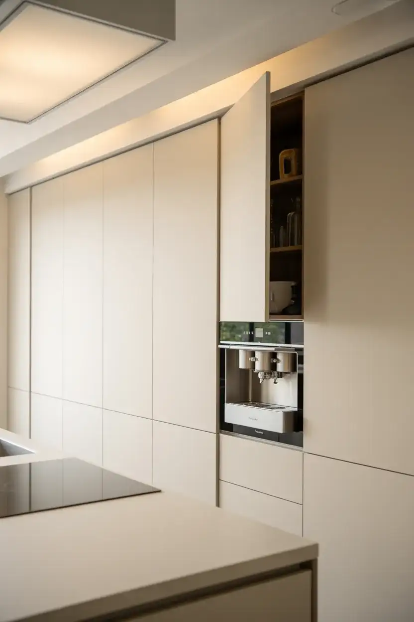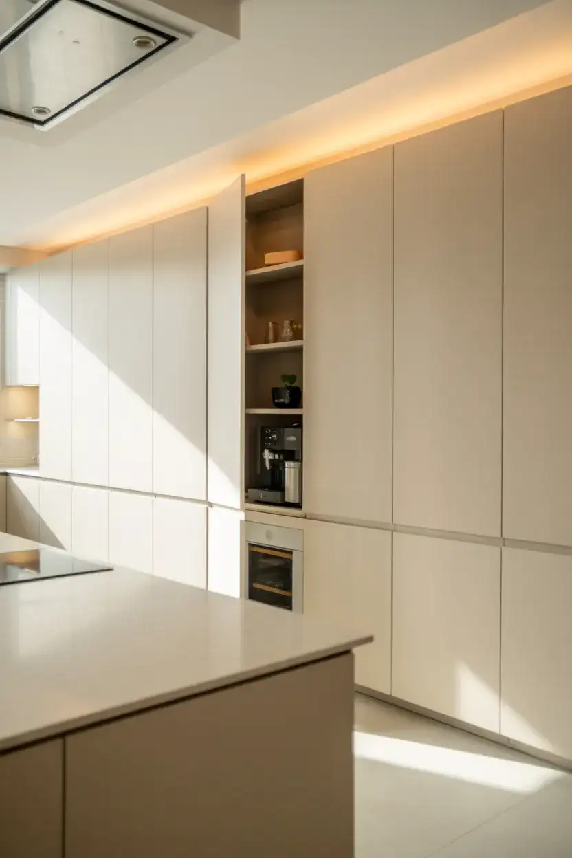 Maximizing every inch of wall space with white floor-to-ceiling cabinetry remains one of the most practical ideas for kitchens where square footage is at a premium. The 2026 twist is all about concealment—appliance garages, retractable doors, and push-to-open mechanisms that eliminate visible hardware for an ultra-clean facade. When closed, the wall reads as a single unbroken plane of white; when opened, it reveals a fully functioning kitchen with everything tucked neatly in place. Its organization is elevated to architecture, and it’s become a signature move in urban renovations across the country.