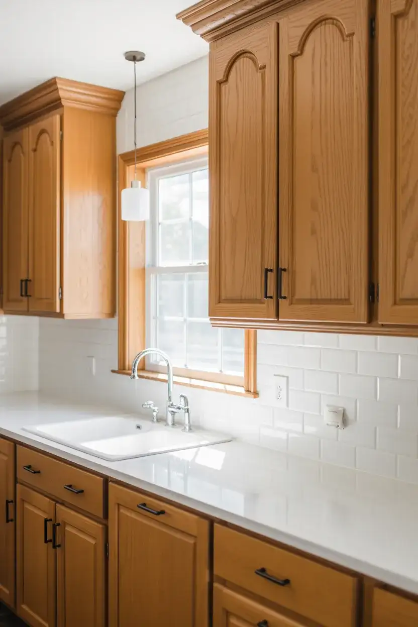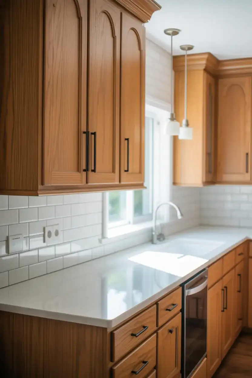 From a budget perspective, this is one of the smartest moves you can make. A full cabinet replacement for an average kitchen runs $15,000 to $30,000 or more, while refinishing existing oak cabinets, adding new hardware, and upgrading countertops can come in under $5,000 total. The environmental angle matters too—keeping solid wood cabinets out of the landfill while giving them a second life is exactly the kind of sustainable choice that resonates with homeowners who care about waste. Sometimes the greenest renovation is the one that works with what you already have.