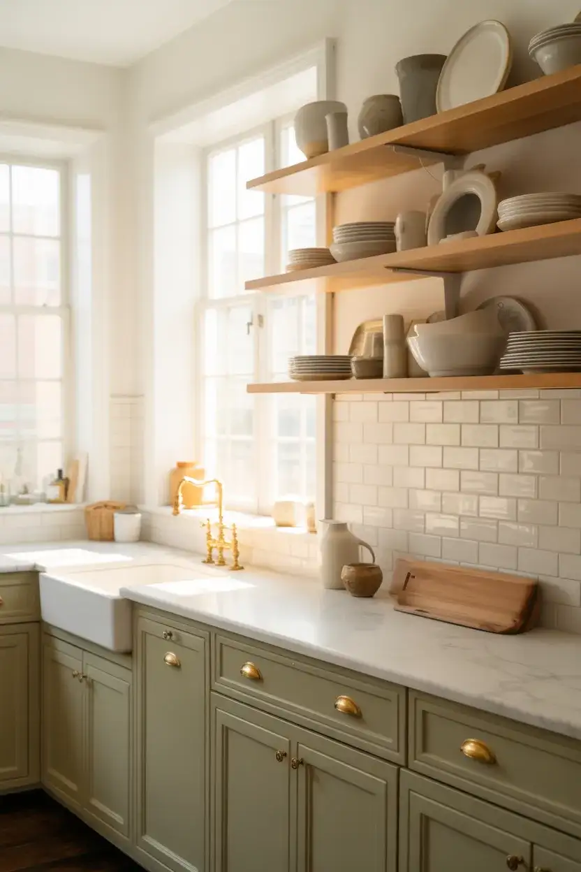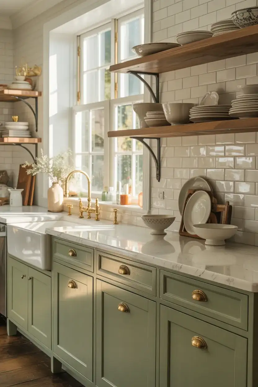 1. Sage Green Shaker Cabinets With Brass Hardware