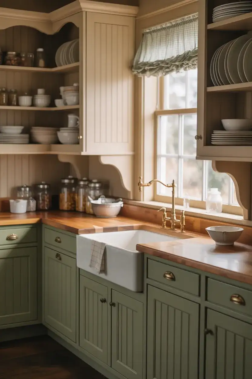 There’s a softness to the sage green and cream combination that feels almost nostalgic—like a kitchen you’d find in a well-loved farmhouse that’s been gradually updated over decades rather than designed all at once. Painted cabinets in muted sage with cream-colored walls and open shelving create a cottage atmosphere that’s warm without being fussy. Beadboard panels, bin pulls in antiqued brass, and butcher block counters round out the look. This is a kitchen that says “come in, sit down, I’ll pour you coffee,” and that approachability is precisely why these ideas keep getting pinned by the thousands.