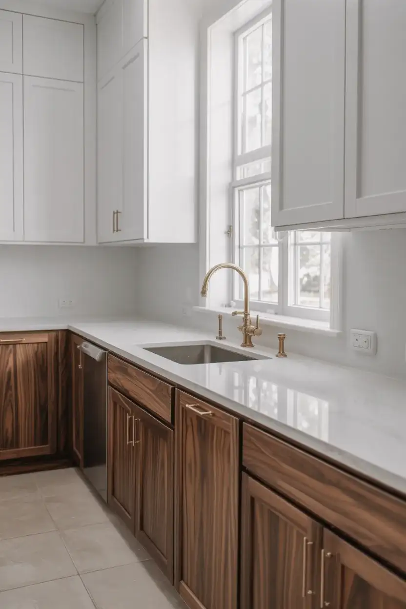 Where this combo really shines is in open-concept homes—especially those ranch-style and mid-century layouts popular across the Midwest and Pacific Northwest. The walnut lowers tie into adjacent wood flooring or living room furniture, while the white uppers keep the kitchen from feeling heavy when viewed from the sofa twenty feet away. It’s the kind of detail that architects think about, but any homeowner can replicate by simply choosing two coordinating cabinet finishes from the same manufacturer’s line. Most major brands now offer this as a standard option; no custom work is required.