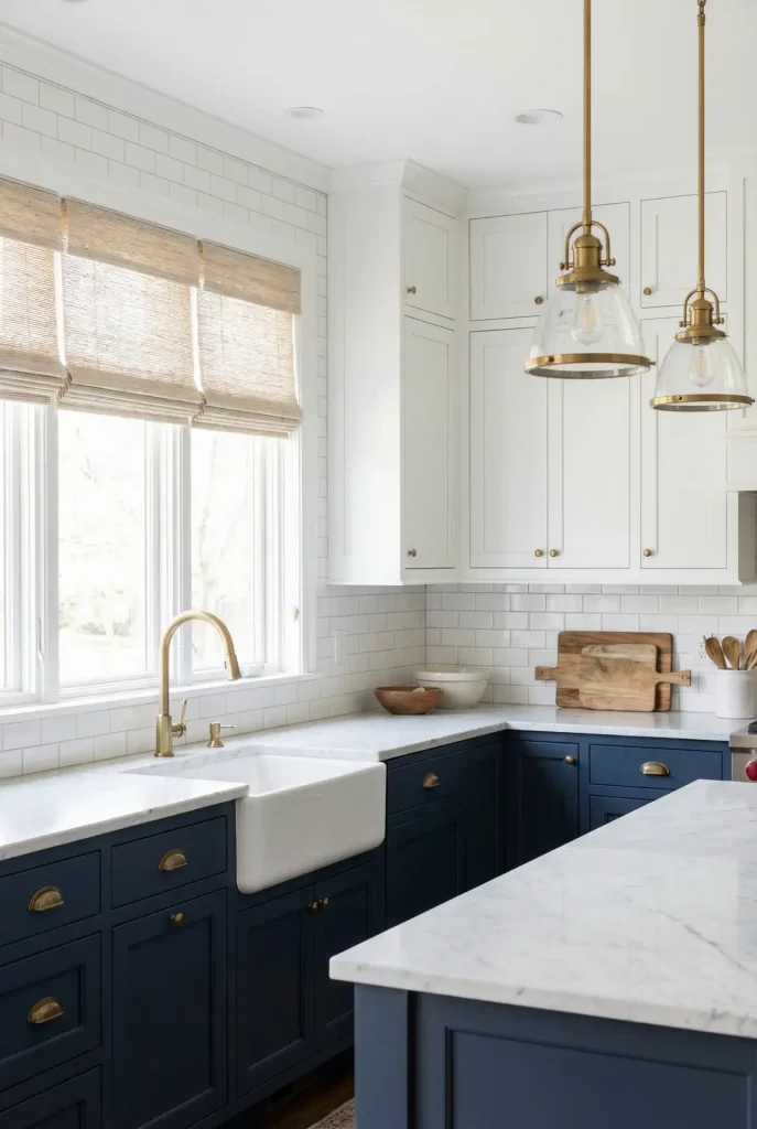 A two-tone kitchen featuring navy lower cabinets and white cabinets on top offers the best of both worlds—the drama of color with the airiness of white. This timeless approach has been popular in American kitchens for years and shows no signs of fading. The navy grounds the space and hides wear on lower cabinets, while the white uppers keep the room feeling open and bright. It’s a smart design move that works in both traditional and contemporary settings.