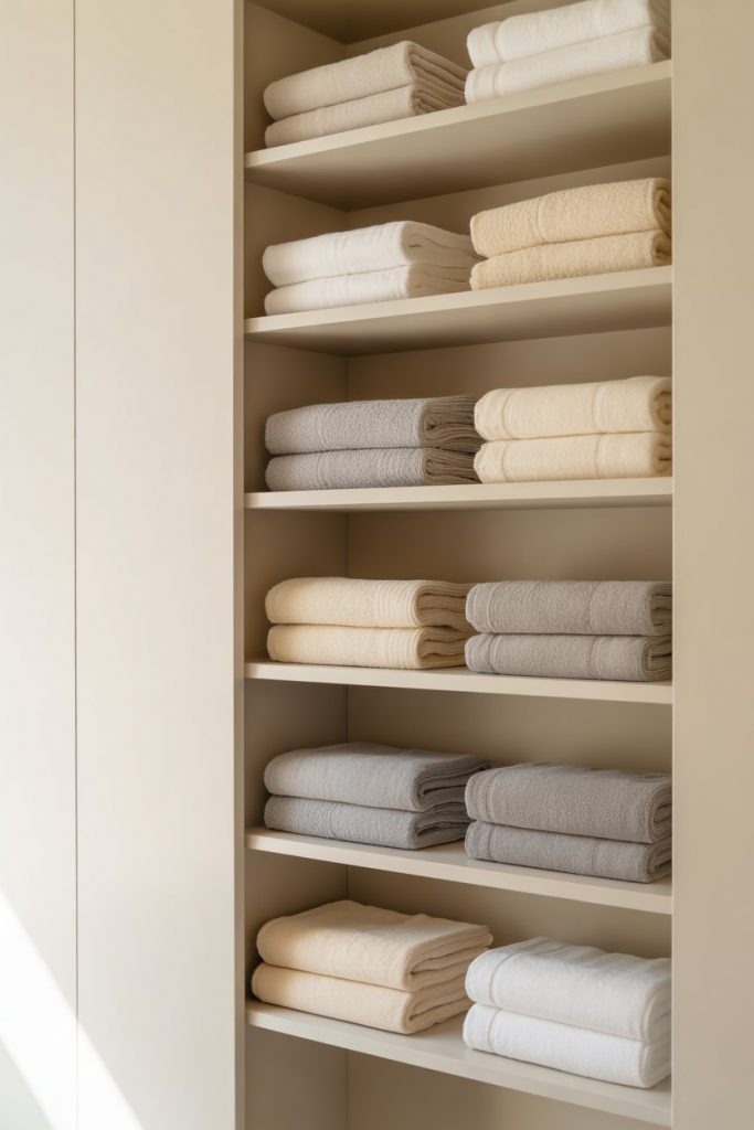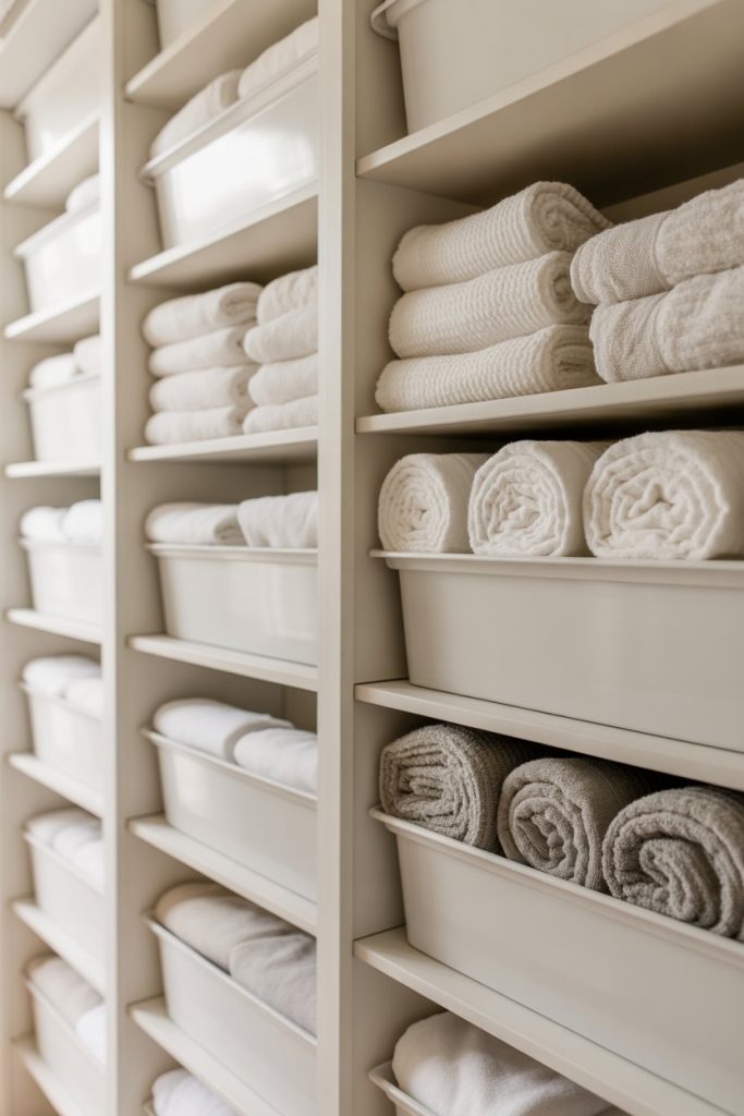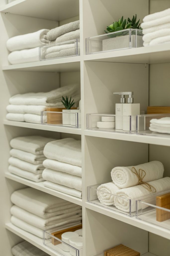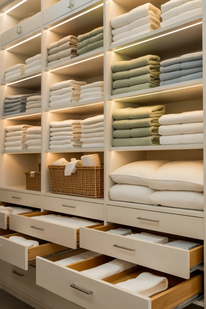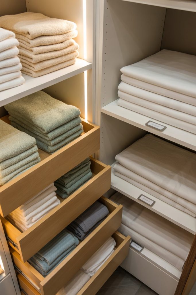 Deep shelf linen closets can quickly become messy without structure. Use sliding bins, pull-out drawers, or lazy Susans to reach back items. Group similar towels and sheets together and label sections. This technique keeps even the deepest storage zones efficient and stylish.