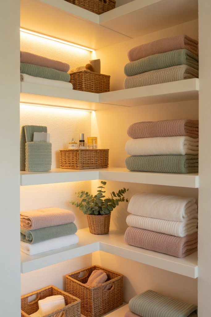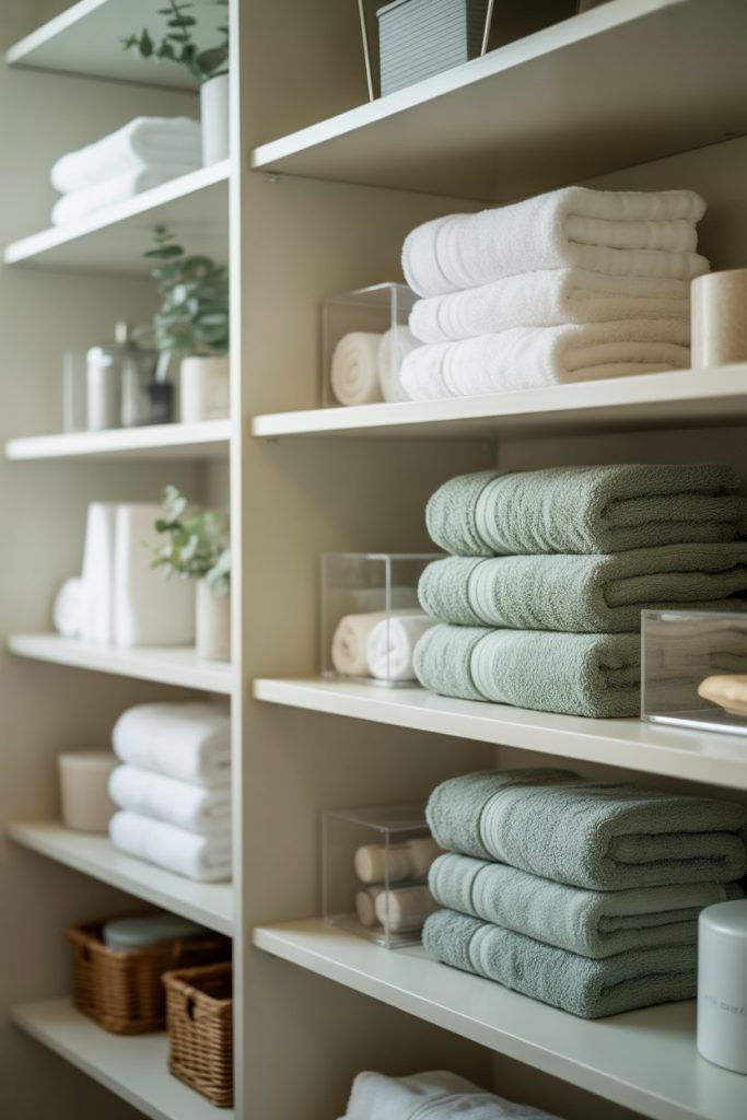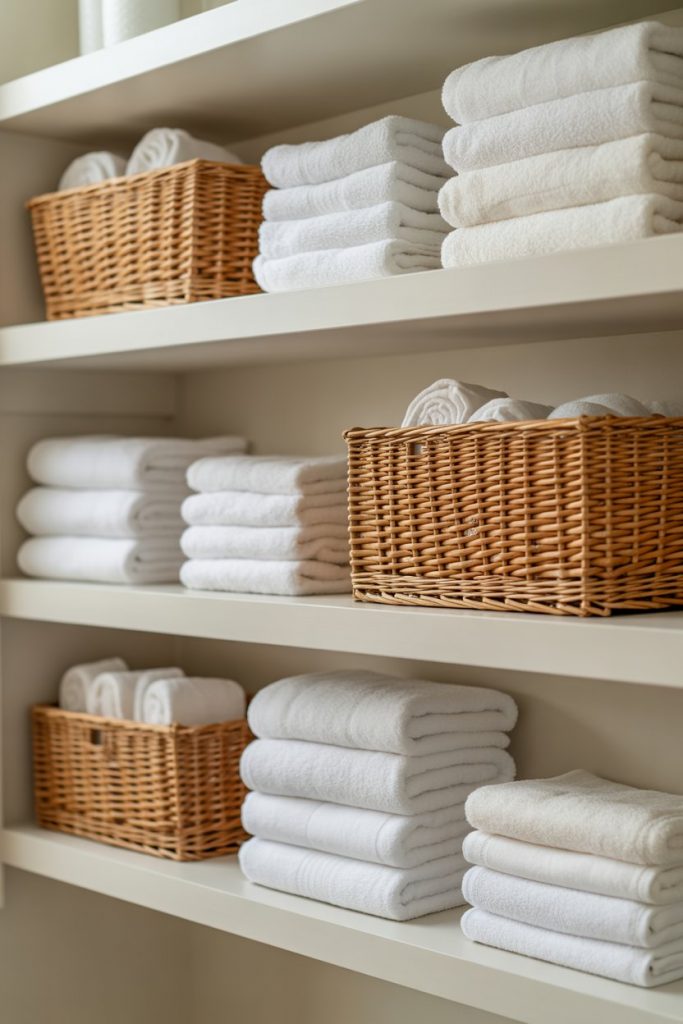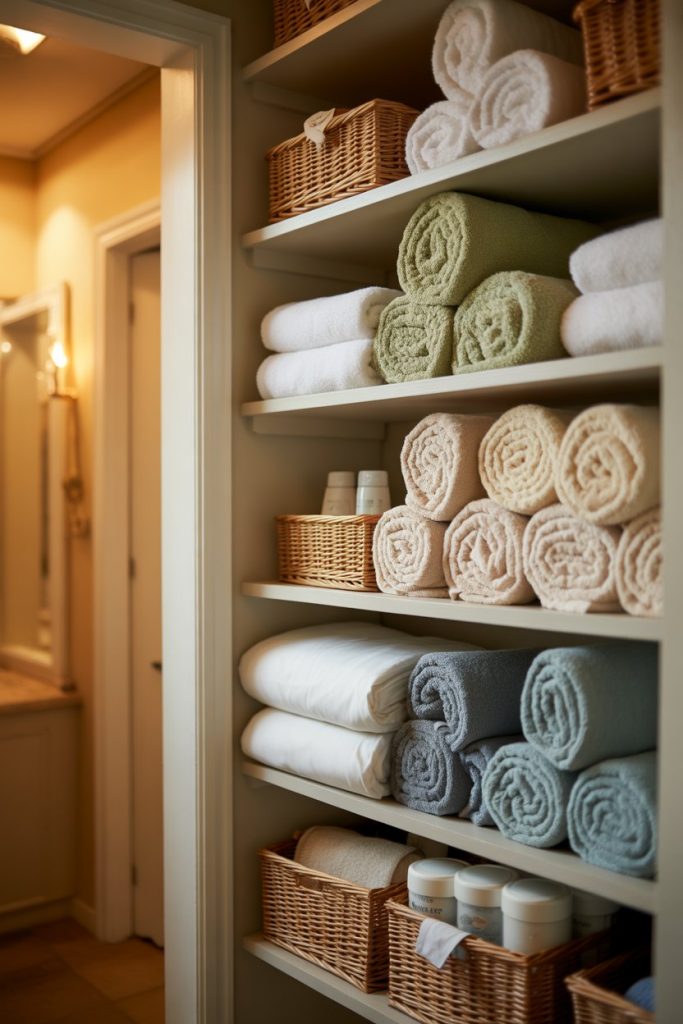 An open bathroom linen system replaces bulky doors with accessible shelves. Use woven baskets for towels, glass jars for small toiletries, and stack sheets neatly for a boutique look. It’s one of those bathroom shelf trend ideas that blends style and convenience.