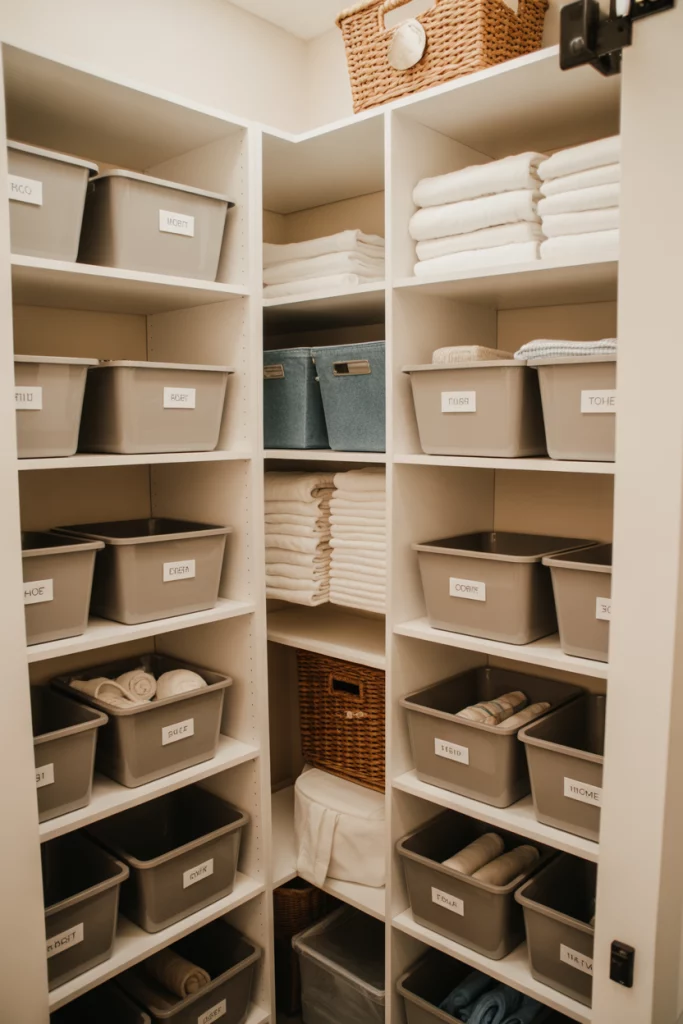For large families, organizing a linen closet means balancing function with accessibility. Use color-coded bins for each person’s towels and sheets, plus labeled shelves for seasonal bedding. Vertical dividers help keep stacks neat—an approach praised by The Spruce for reducing daily chaos.