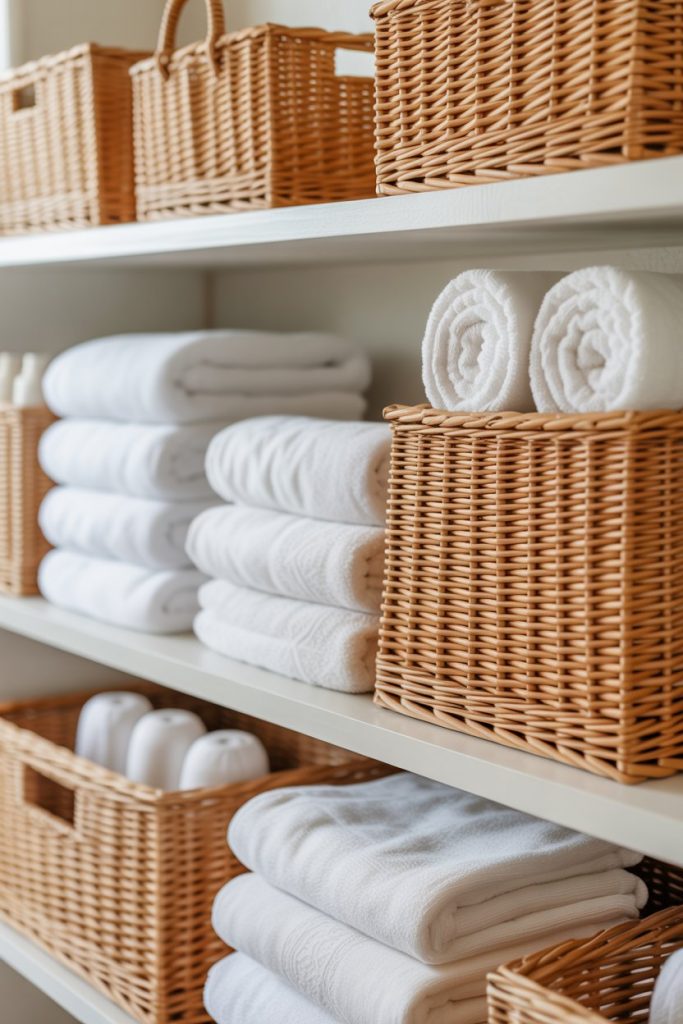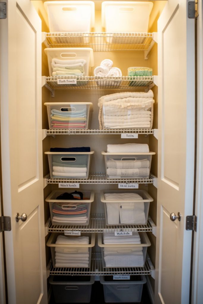 Labeling is the simplest DIY upgrade that instantly improves your linen closet. Use chalkboard tags or printed labels for each shelf—towels, sheets, bedding, and cleaning items. It’s a small change that adds major efficiency and a tidy, aesthetic appeal.