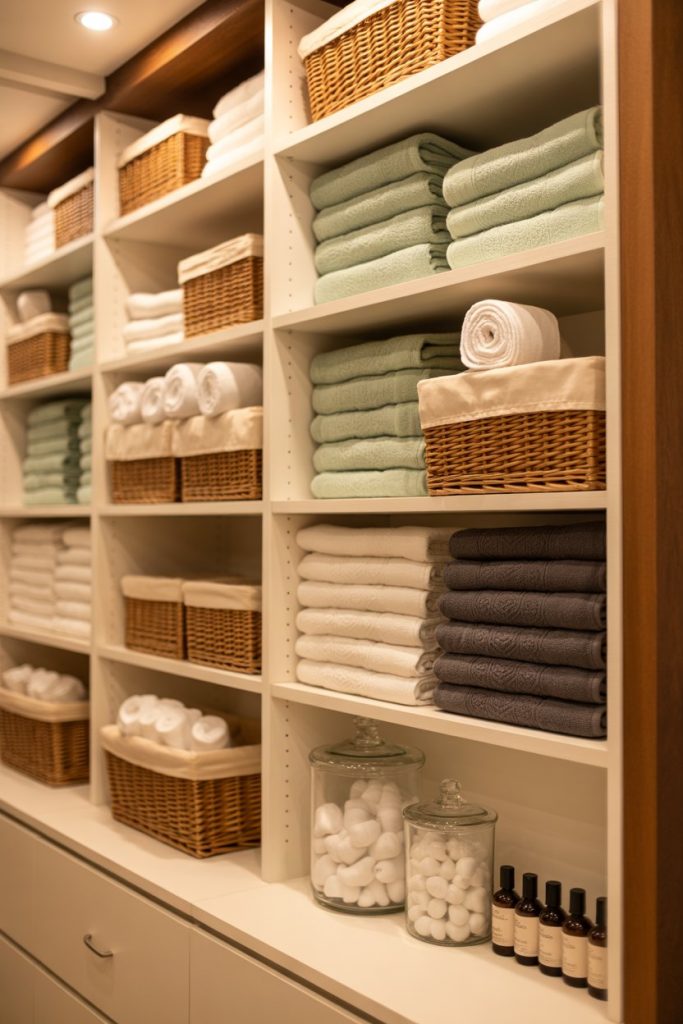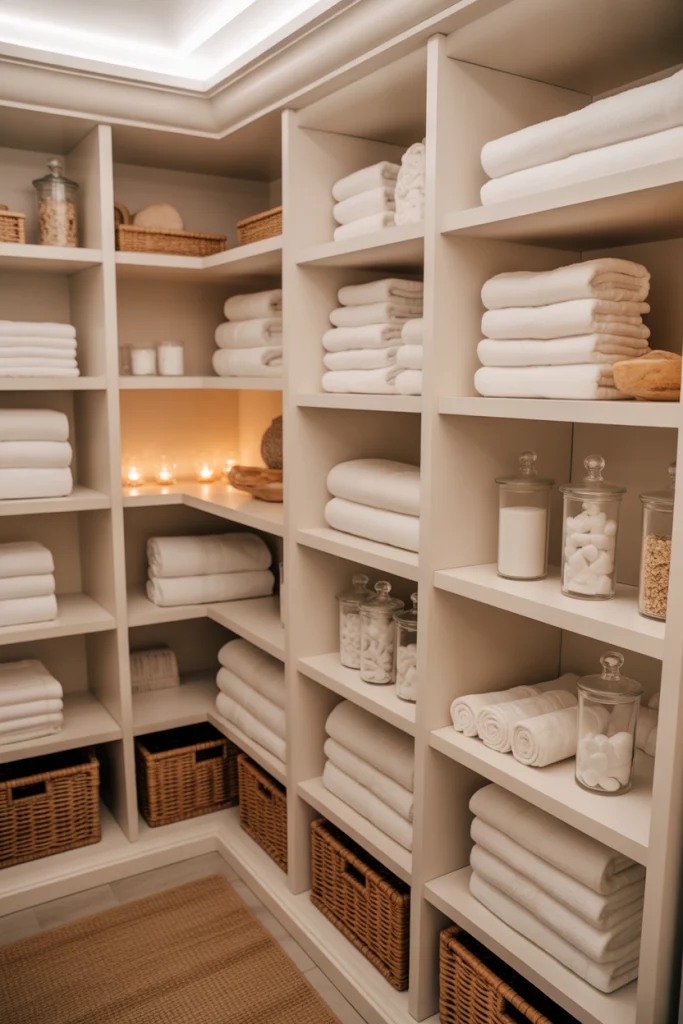 Turn your walk-in linen closet into a serene spa retreat. Include shelves for plush towels, aromatherapy baskets, and labeled jars for bath salts. It’s one of 2026’s most luxurious ideas that bathroom enthusiasts love—relaxing yet organized.