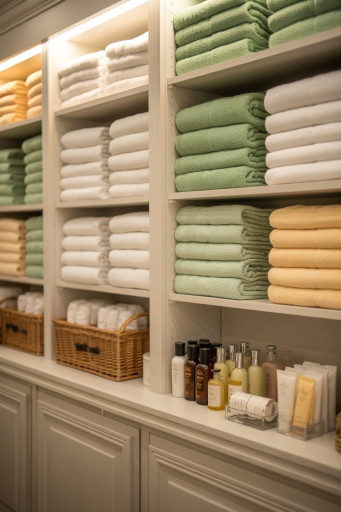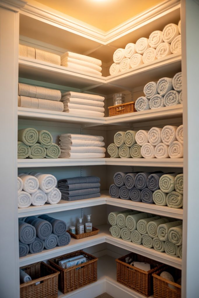 Transform a hall linen closet into a welcoming guest hub. Keep a separate section with spare towels, travel-size toiletries, and neatly folded sheets. This aesthetic touch makes guests feel cared for and keeps your essentials ready for last-minute visits.