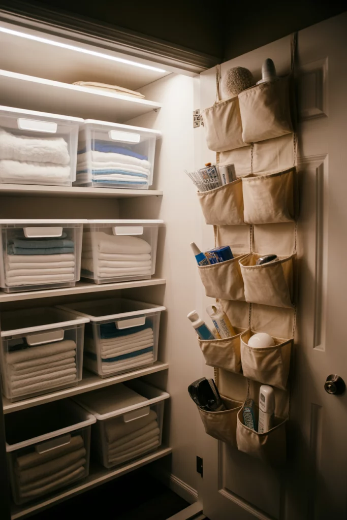 Apartment living often means dealing with tiny or awkward closets. Stack baskets vertically, install over-the-door racks, and use transparent bins for quick visibility. This method creates an illusion of space while keeping every towel and sheet easy to reach.