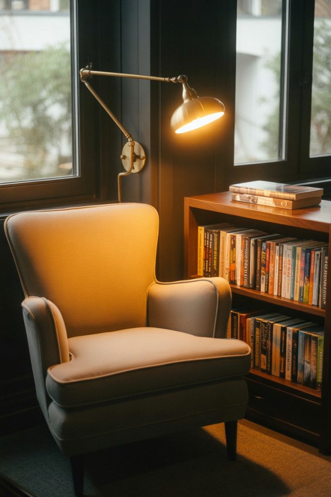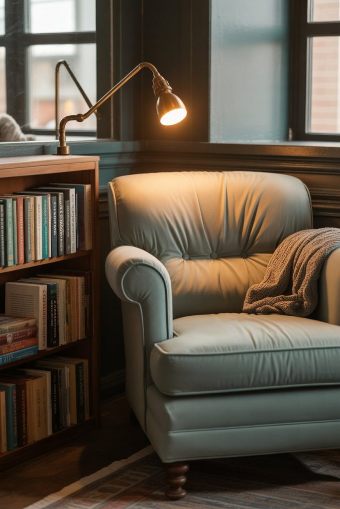 Common mistake: Using a lamp with a shade that’s too opaque, which blocks the light you need for reading. Look for shades in linen or frosted glass that diffuse light gently while still providing adequate brightness. A 60-watt equivalent LED bulb in warm white (2700K) hits the sweet spot between cozy and functional.