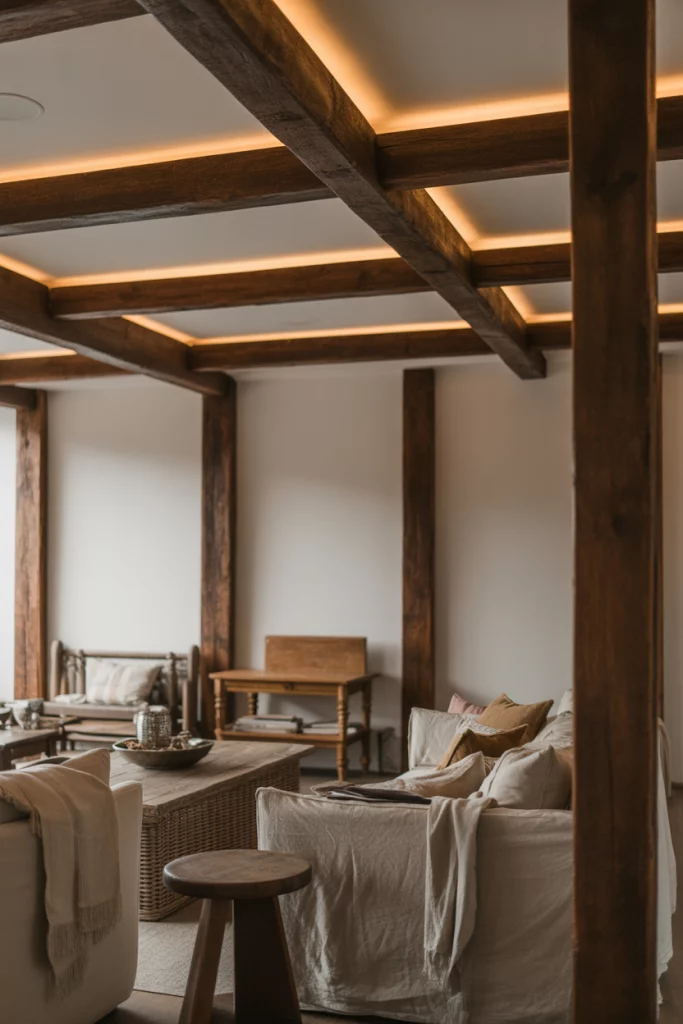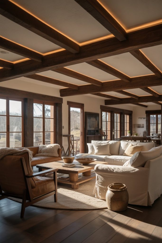 Exposed wood beams are having a major moment, and lighting them properly transforms them from architectural detail to showstopper. LED strip lights installed along the top or sides of beams create a soft uplight that highlights the grain and texture while adding depth to the ceiling. This technique works especially well in farmhouse or rustic-modern living rooms where the beams are stained in warm tones. You can also mount small track lights or adjustable spotlights to the beams themselves, directing light downward onto seating areas or artwork.
