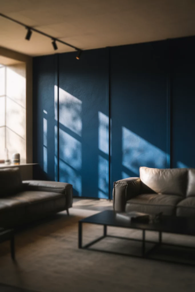 A blue accent wall—whether navy, midnight, or teal—deserves lighting that enhances its richness and depth. Directional spotlights or adjustable track lights positioned to graze the wall at an angle bring out the color’s saturation while adding drama and dimension. This technique, called wall washing, works especially well in living rooms with textured finishes (think Venetian plaster or grasscloth wallpaper) where the interplay of light and shadow creates visual interest. Pair this with ambient lighting from table lamps or floor lamps to keep the room balanced and inviting.