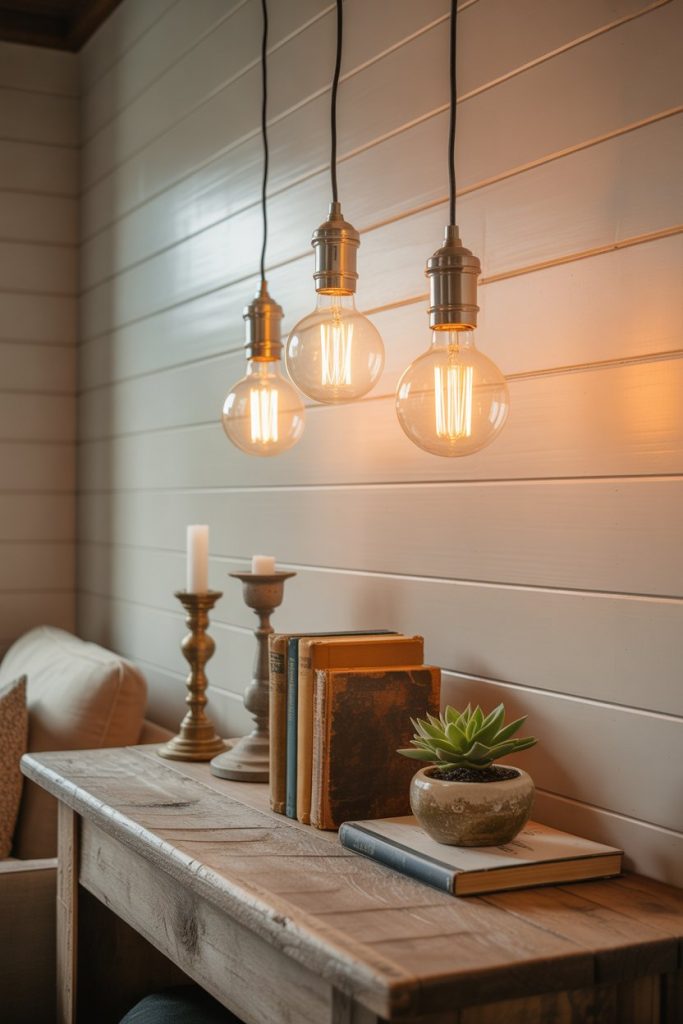 The farmhouse trend refuses to die, and for good reason: it’s approachable, warm, and endlessly adaptable. Edison bulb pendants—those exposed-filament beauties suspended from simple cords—bring instant character to living rooms that crave a rustic, lived-in feel. Hang them in a row over a console table, or cluster three at varying heights in an open corner. The amber glow of Edison bulbs is inherently flattering, casting a vintage-inspired warmth that pairs beautifully with reclaimed wood beams, shiplap walls, or even modern furniture that needs a little softening.