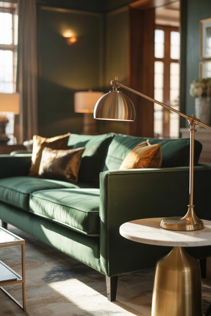 A green velvet sofa is a bold choice that demands equally considered lighting, and brass task lamps deliver the perfect counterpoint. These adjustable, swing-arm fixtures—whether mounted on the wall or placed on a side table—offer focused light for reading or working while their warm metallic finish complements the richness of green upholstery. In living rooms with moody paint colors (think charcoal, deep teal, or forest green), brass adds a luxe touch that prevents the space from feeling too dark or heavy. The combination reads sophisticated without veering into stuffy territory.