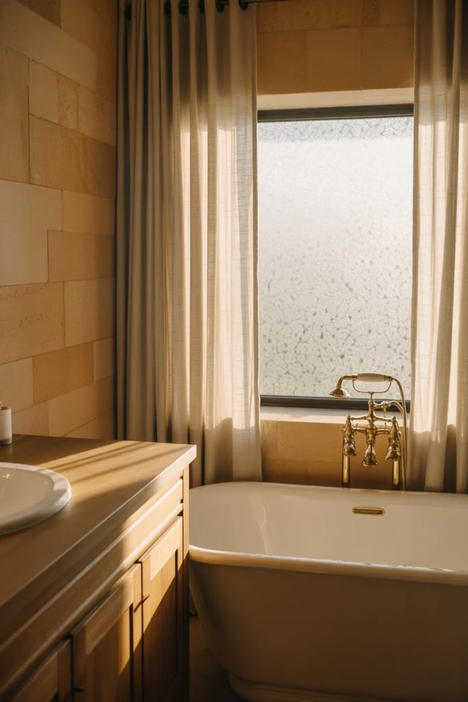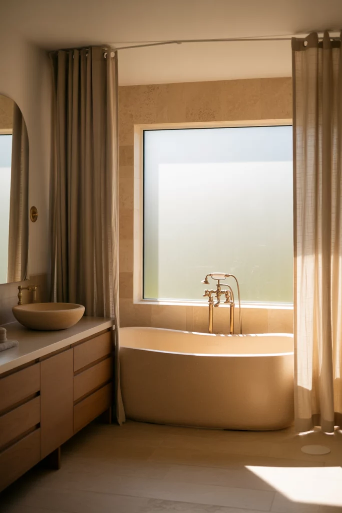 This works best in homes where the bedroom already leans toward calm, earthy tones — extending that palette into the bath creates a cohesive suite. Many homeowners add a small wooden stool or bench near the tub, which becomes the perfect spot for a stack of folded towels or a potted plant. Skip the urge to over-accessorize; in spa-style spaces, restraint is what makes the design feel intentional rather than cluttered.