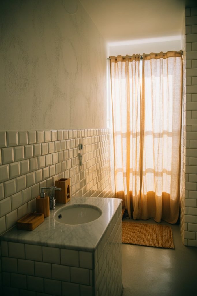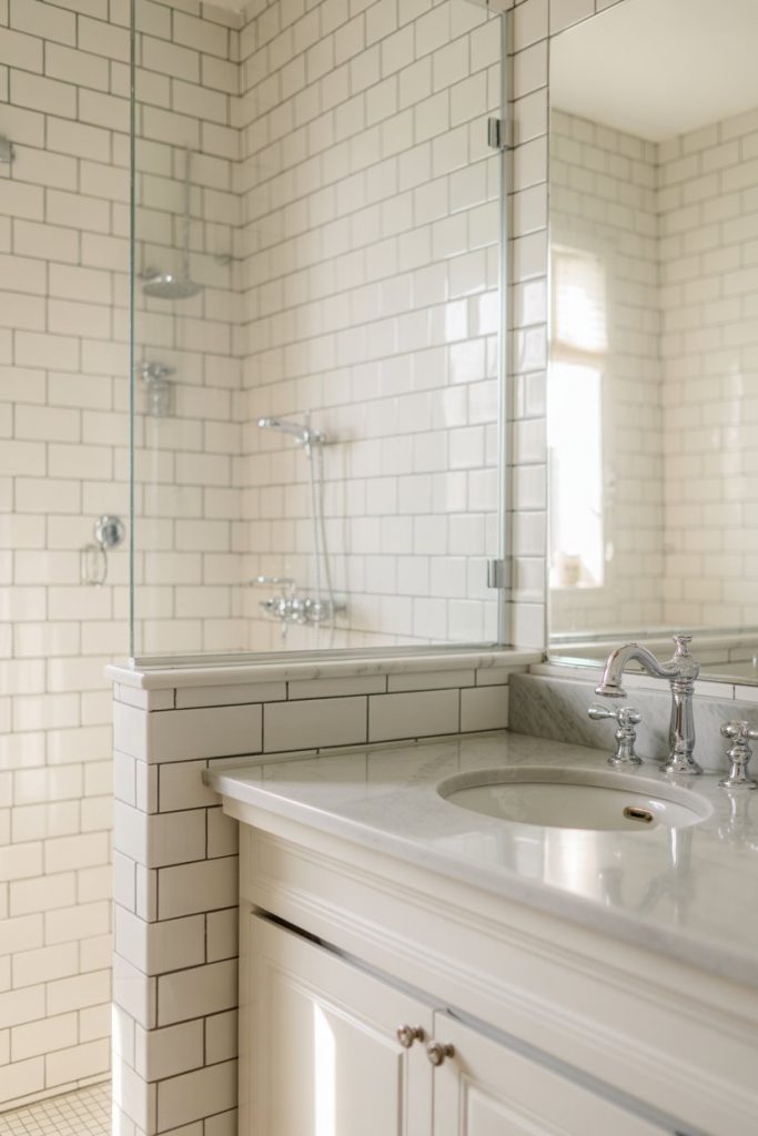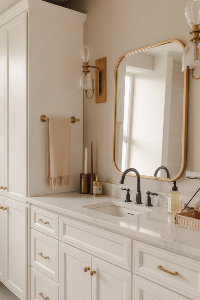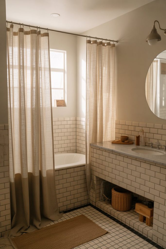 Create depth in a neutral bathroom by layering different textures: matte white paint, glossy subway tile, honed marble counters, and linen window treatments. Add tactile elements like a chunky knit bath mat, wooden tray, or ceramic soap dispenser. This approach keeps the space feeling warm and curated rather than flat and boring. It’s perfect for modern master bathrooms where you want sophistication without relying on bold color.