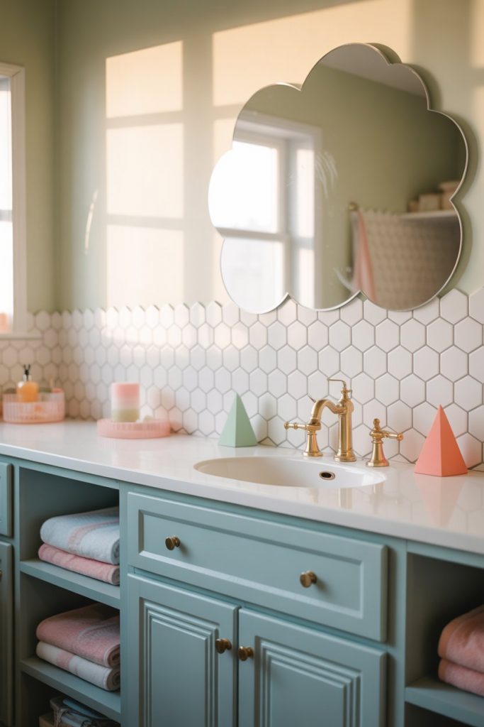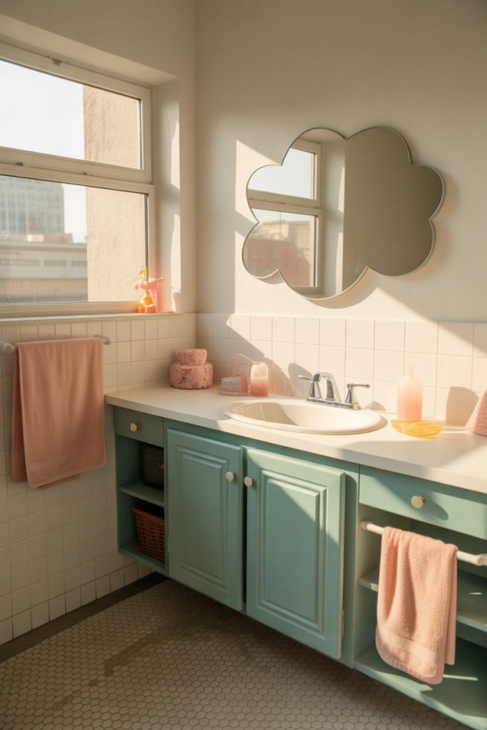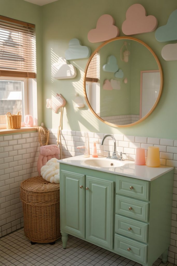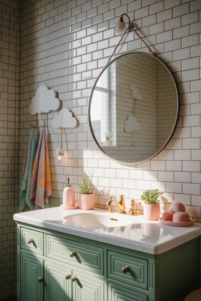 Inspired by the playful aesthetics of Toca Boca games, this style leans into soft pastels, rounded edges, and cheerful decor. Think a pink or mint-green vanity with round knobs, circular mirrors, and wall hooks shaped like little characters or clouds. This works especially well in kids’ guest bathrooms where function meets fun. Balance the playfulness with white tile and simple fixtures so the room doesn’t feel too cartoonish.