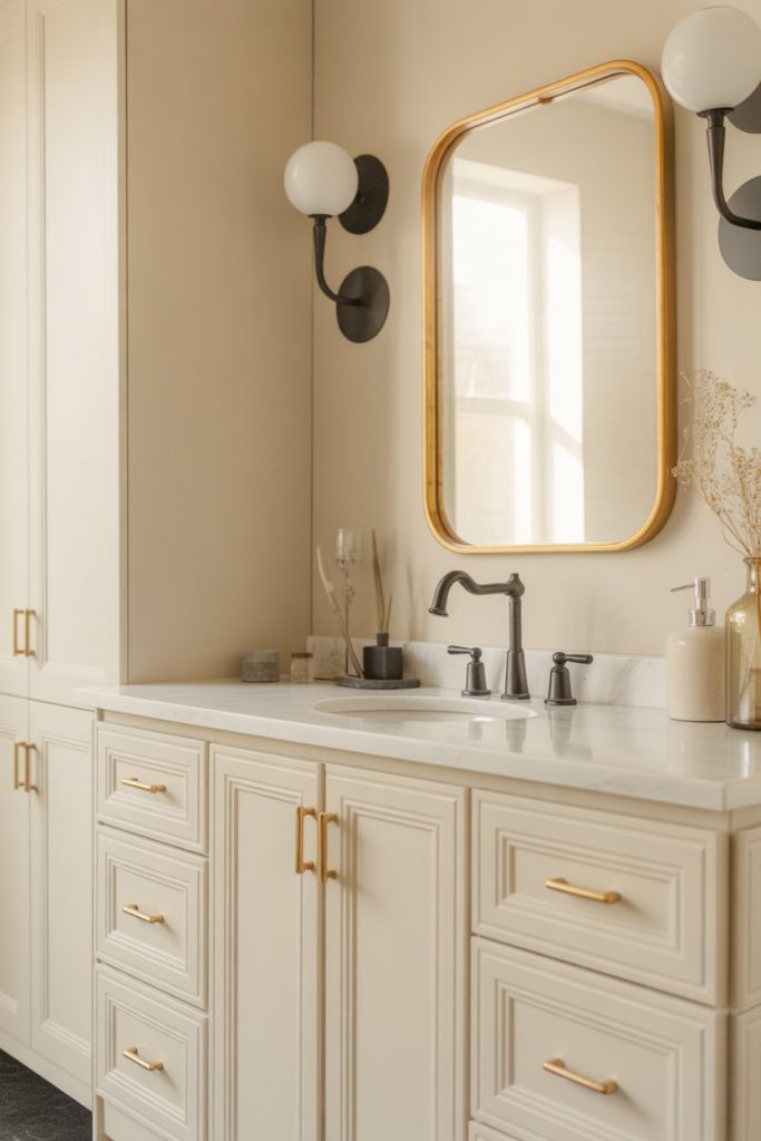 Don’t be afraid to mix black matte fixtures with brass or gold accents in a modern bathroom. This layered approach adds visual interest and keeps the space from feeling too matchy-matchy. Try black faucets with a gold-framed mirror, or brass cabinet pulls against white shaker-style vanity doors. The key is to repeat each finish at least twice so it looks intentional rather than random. This trend is especially popular in primary and ensuite bathrooms where you want a designer look.
