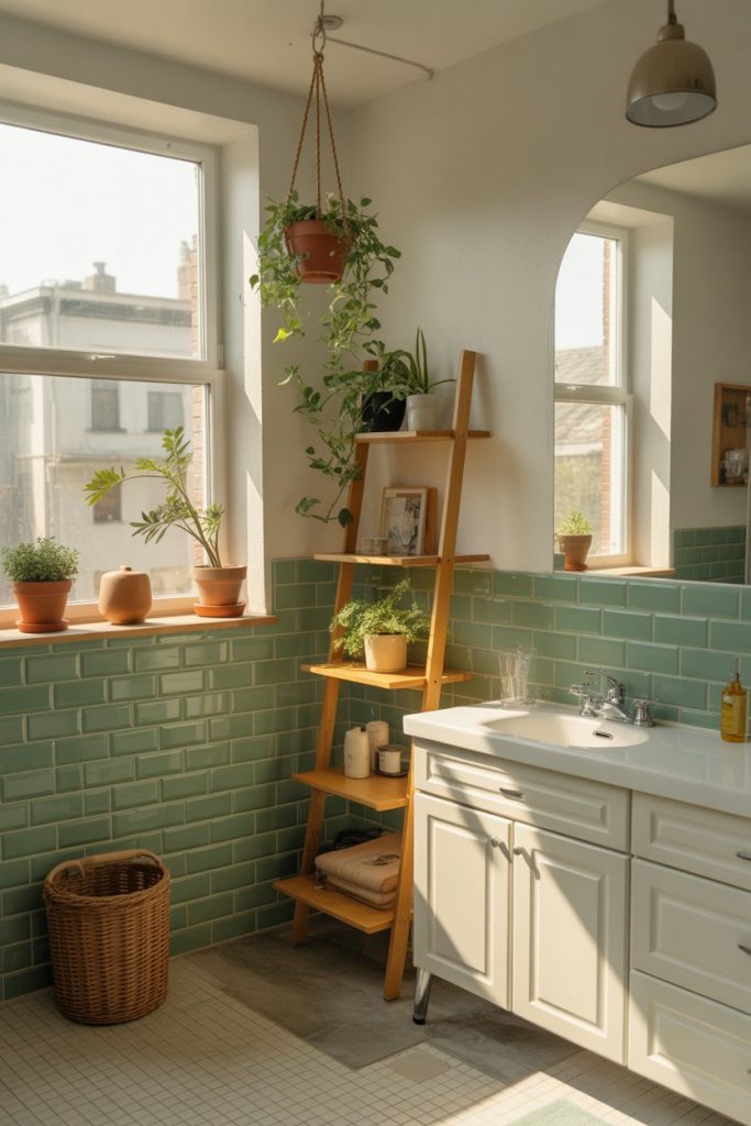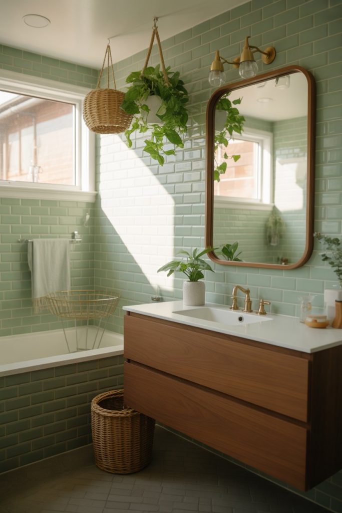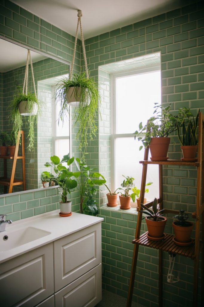 Bring the outdoors in by designing a green bathroom filled with plants, natural light, and earthy textures. Think potted ferns on floating shelves, trailing pothos near the window, and maybe even a small fiddle leaf fig in the corner if you have the ceiling height. Combine this with neutral tile in soft whites or creams, and add rustic wood accents through the vanity or mirror frame. The result feels fresh, alive, and completely on-trend for 2026.
