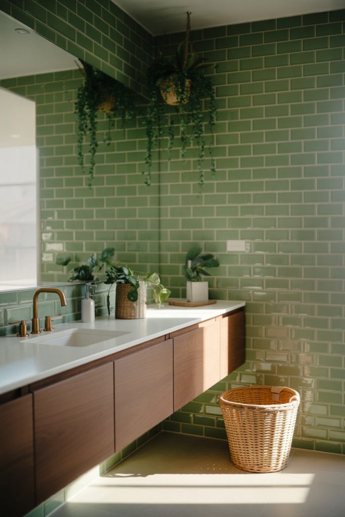 Combine green tile or paint with natural wood elements for an organic, grounded aesthetic. Sage or olive green walls paired with a teak or walnut vanity create a spa-like feel that’s also distinctly modern. Add plants, woven baskets, and neutral linens to reinforce the natural theme. This palette works beautifully in ensuite bathrooms where you want to wake up feeling refreshed and connected to nature.