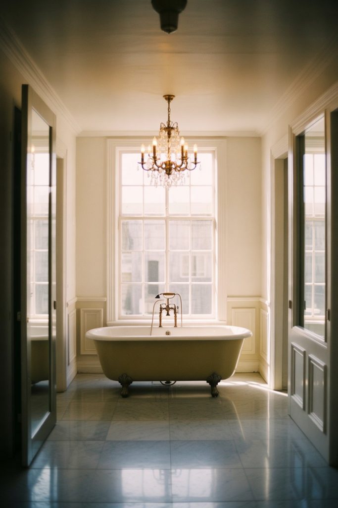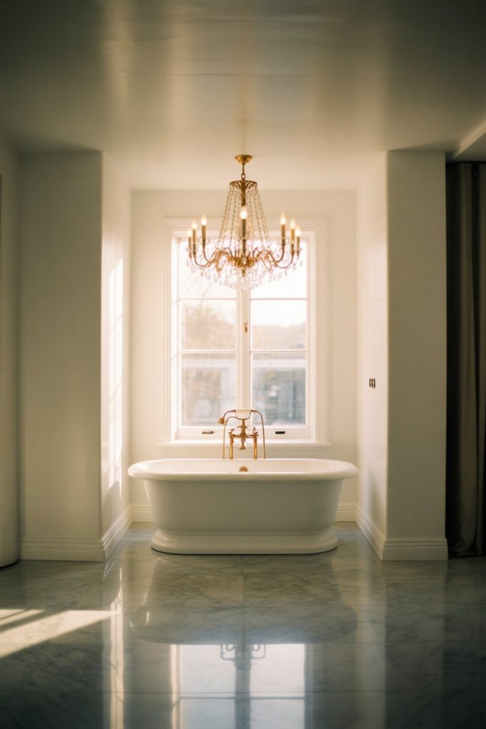 Swap out boring builder-grade fixtures for a statement chandelier or sculptural pendant light. This works particularly well in master bathrooms with high ceilings or over a freestanding tub. Choose a finish that complements your overall palette — brass for warmth, matte black for modern edge, or crystal for traditional elegance. The lighting becomes both functional and a piece of art. Just make sure it’s rated for damp or wet locations depending on placement.