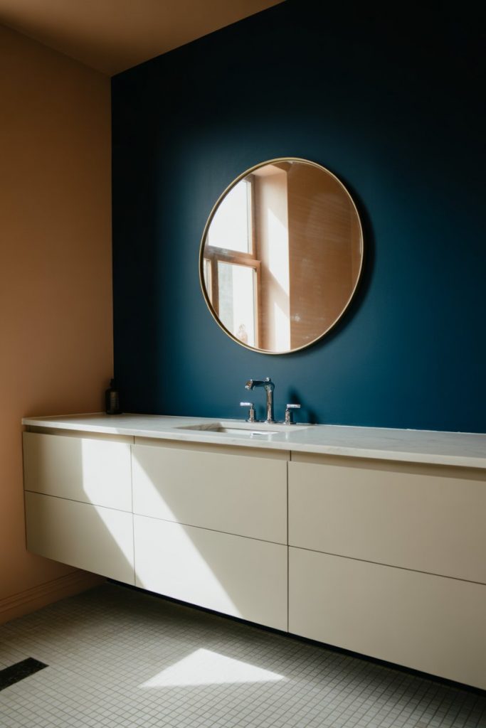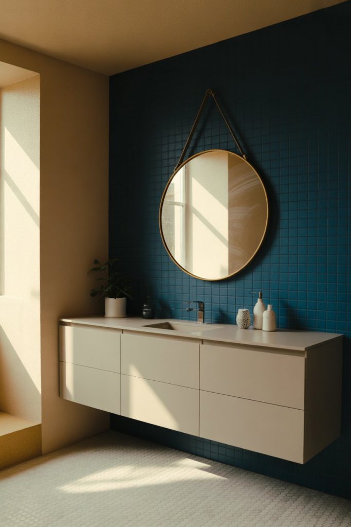 A single blue accent wall behind the vanity or tub instantly elevates a modern bathroom without overwhelming the space. Choose deeper shades like navy or teal for drama, or softer sky blues if you want something more serene. Pair it with white subway tile, chrome fixtures, and light wood cabinetry to keep the look balanced. This trick works particularly well in small full bathrooms where you want personality but can’t afford to make every surface bold.