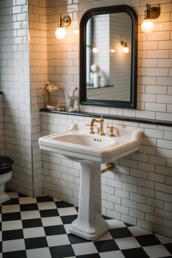 The timeless black and white palette never fades, and in 2026 it’s being reimagined with softer edges and warmer metals. Try white marble-look tile with black grout for definition, or classic checkerboard floors paired with matte black fixtures. This scheme works beautifully in guest bathrooms where you want something elegant but not overly personal. Add brass or gold hardware to warm up the contrast and keep it from feeling too stark.