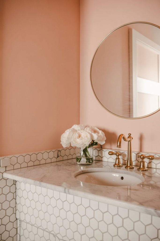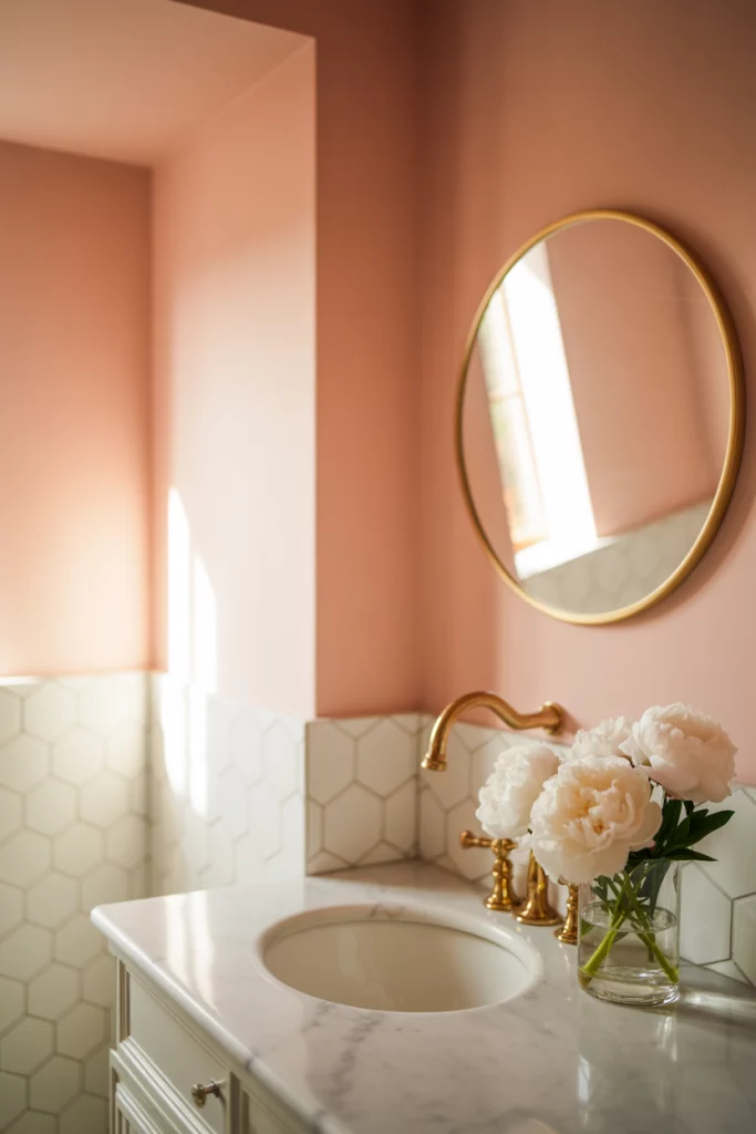 Soft pink tones are having a major moment, especially in half baths where you can take more creative risks. Think blush tiles, rosy wallpaper, or even a painted vanity in dusty rose paired with white fixtures and gold hardware. This palette feels feminine without being overly sweet, and it photographs beautifully for those Pinterest-worthy reveals. It’s a smart choice for cute powder rooms that guests will actually remember.