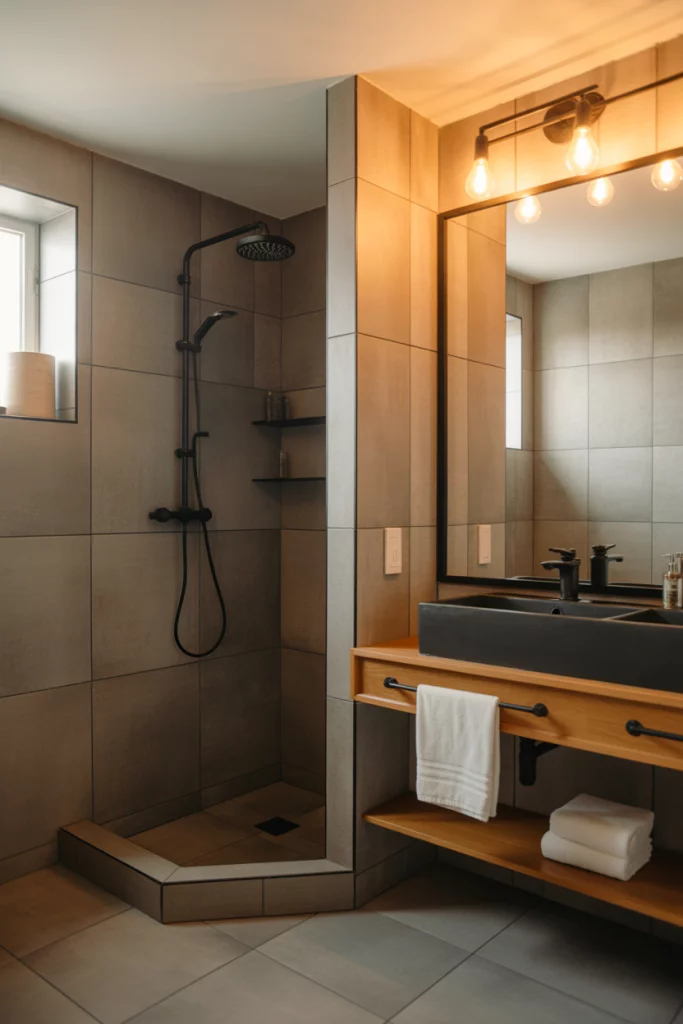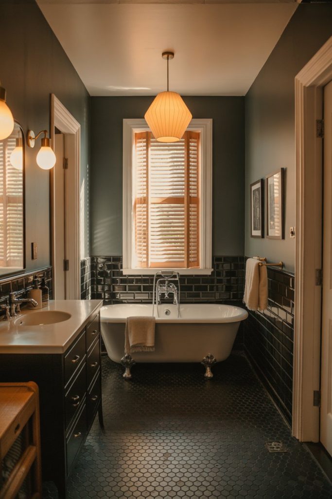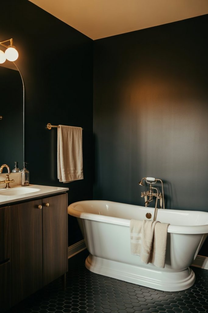 Embrace the drama of a dark bathroom by layering charcoal walls, black tile, and deep wood tones. This approach works surprisingly well in ensuite layouts where you want a cocoon-like, intimate atmosphere. Balance the darkness with plenty of warm lighting — think brass sconces, pendant lights, and even LED strips under floating vanities. Add white or cream accents through towels and bath linens to prevent the space from feeling cave-like.