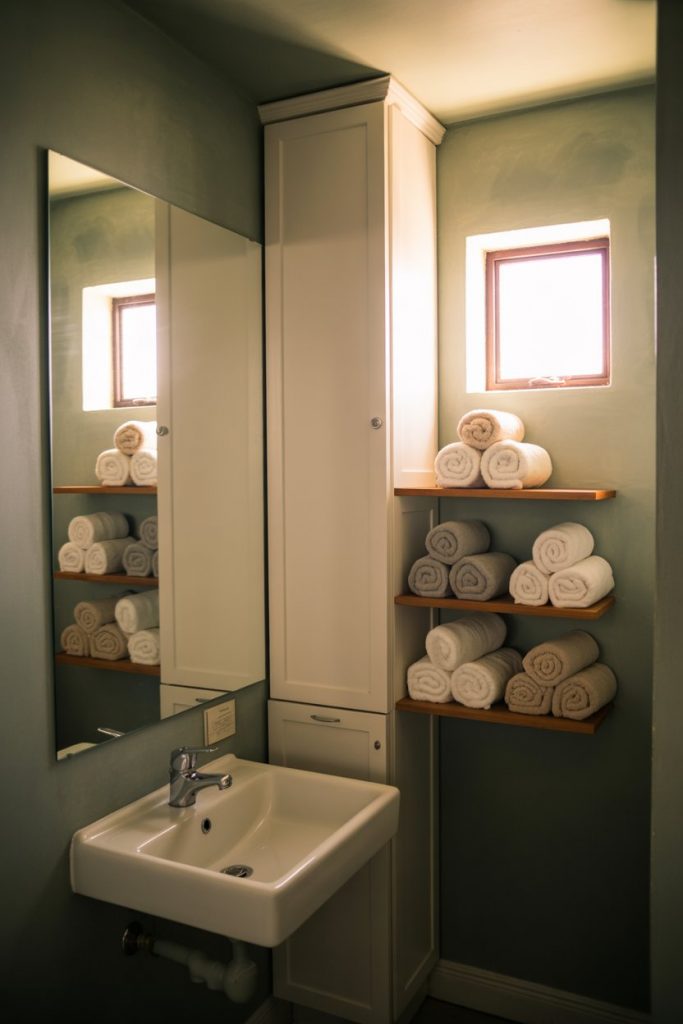 In tiny or small spaces, going vertical is the key to maximizing every inch. Install tall, narrow cabinets that reach the ceiling, use floating shelves above the toilet, and consider a recessed medicine cabinet to save precious wall space. Choose light colors like white or soft grey to keep the room from feeling cramped. Even a small half bath can feel functional and stylish when you think upward instead of outward.