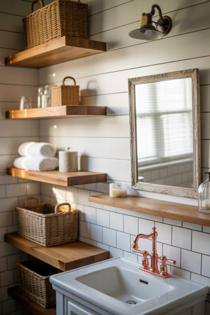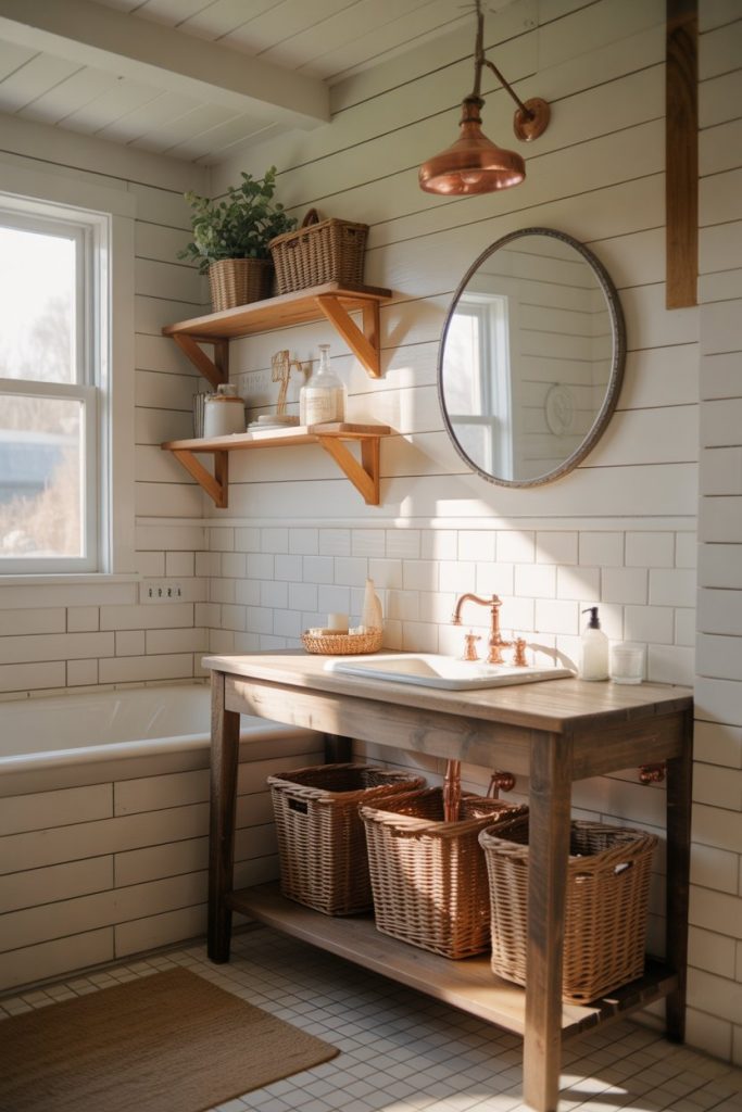 Channel rustic warmth with reclaimed wood accents, shiplap walls, and vintage-inspired fixtures. A barn door sliding into the bathroom, open shelving made from salvaged lumber, and a copper or bronze faucet all contribute to this lived-in, cozy aesthetic. Pair these elements with white subway tile and neutral paint colors to keep it from feeling too themed. This style is perfect for guest bathrooms in homes with farmhouse or cottage architecture.