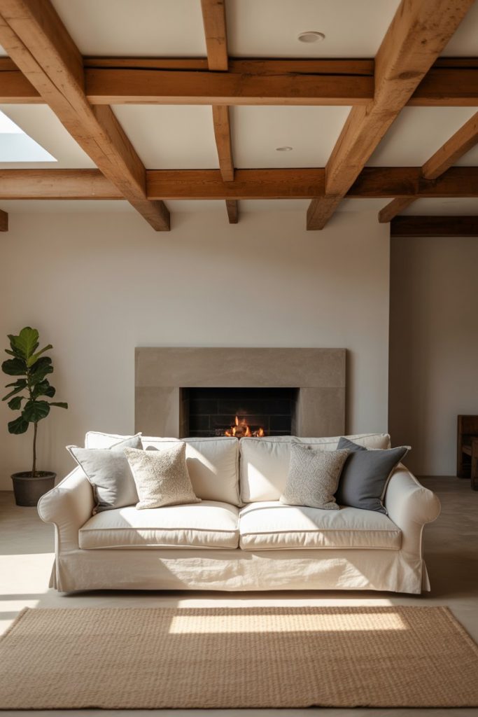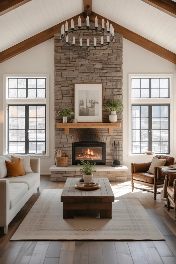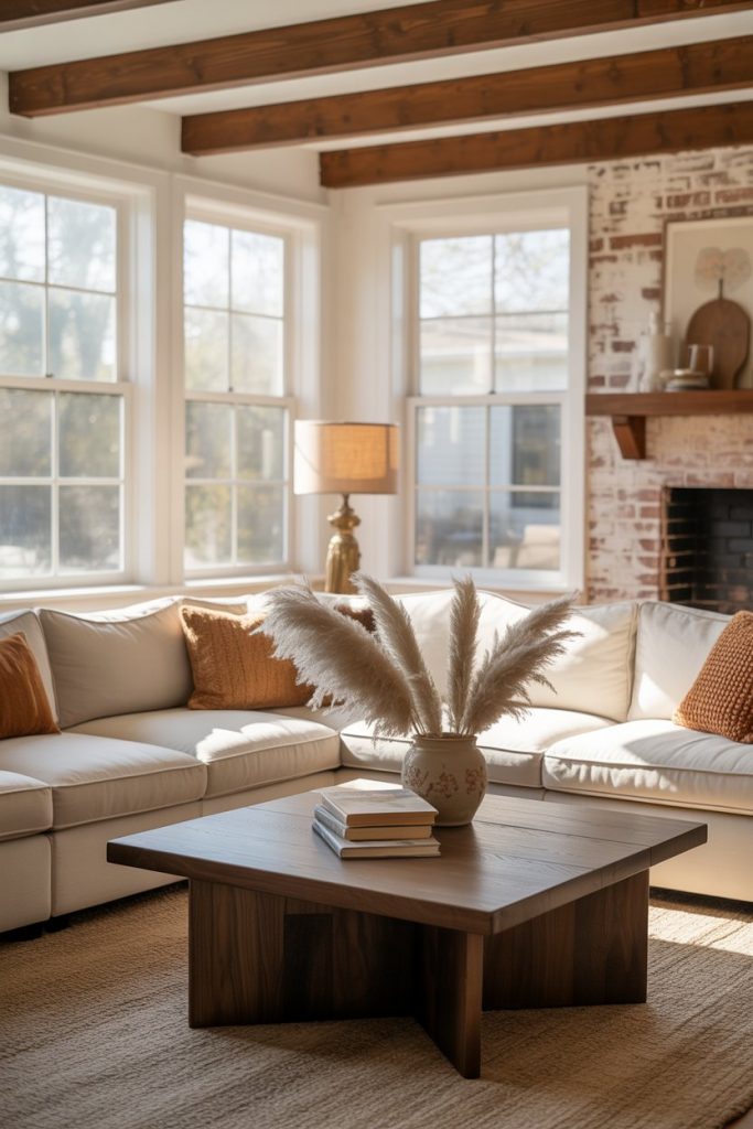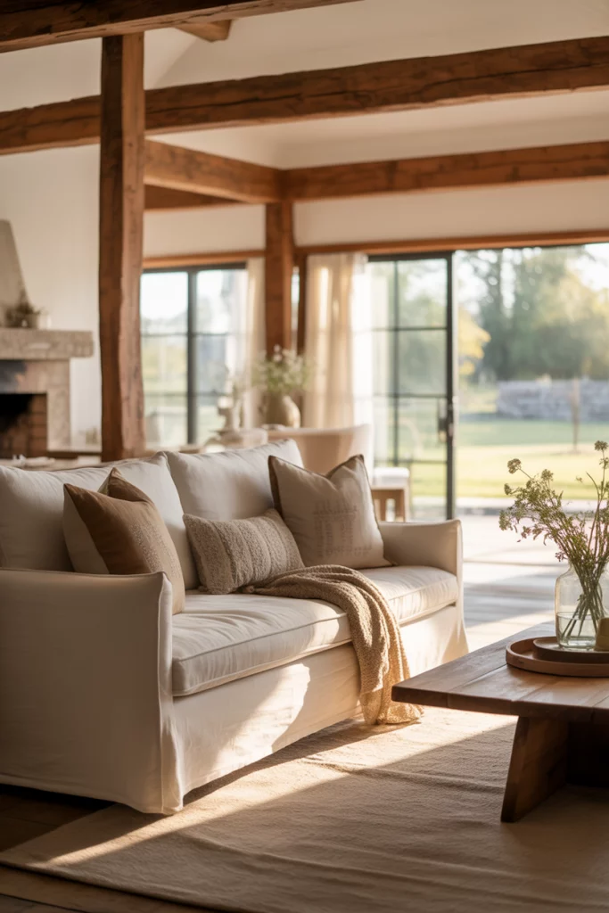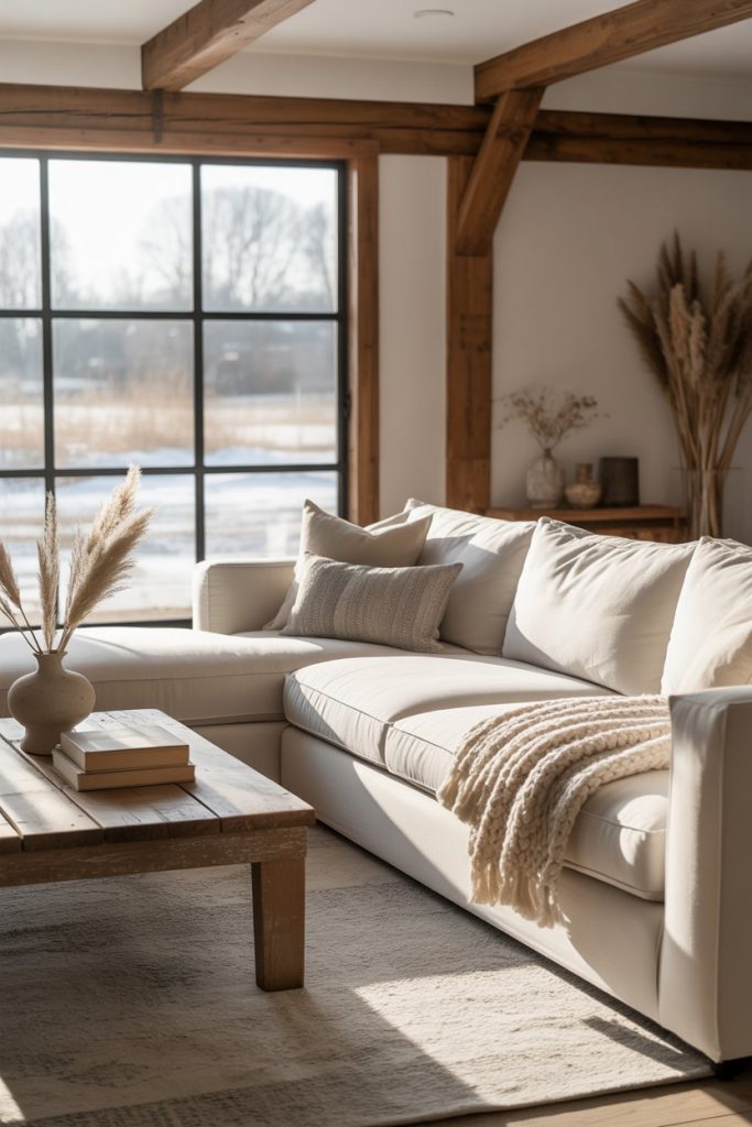 Creamy white walls and warm wooden beams are still trademarks of the modern farmhouse style. This setup feels a bit airy and a bit grounded as it is simplicity with comfort. Wood furniture and creamy whites will keep your living room cozy and balanced naturally.